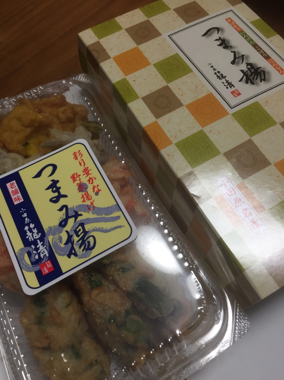 箱根帰りの小田原土産として籠清のつまみ揚げなどなどを買いました。つまみ揚げは手軽でおいしかった!焼いてよし、そのままでもよし、ビールのお供に最適でした。