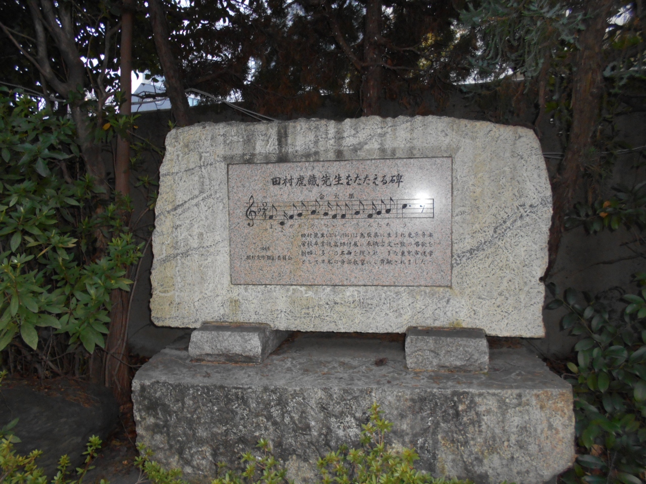 大正時代から昭和初期にかけて、「言文一致唱歌」の改革を行った作曲家の方の功績をたたえる碑らしく、童謡「きんたろう」の有名なフレーズの譜面と歌詞が刻まれている、素敵な碑でした。