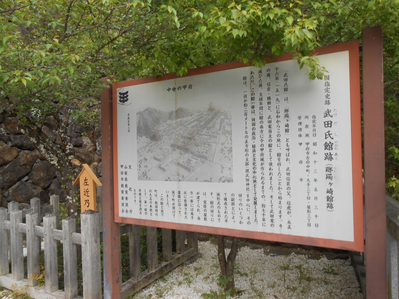 甲府駅から車で10分程の武田信玄を祀る武田神社がある場所に、かつて、武田氏の館があったようです。この館は、別名「躑躅が崎館と(つつじがさきやかた)」と呼ばれていたようです。当時の面影は全くなく、境内の入口付近に案内板があるのみです。特に、見応えがある訳ではないですが、武田神社は、広大な敷地にあり、この敷地に館があったということは相当大きな館だったことが窺え、驚かされました。