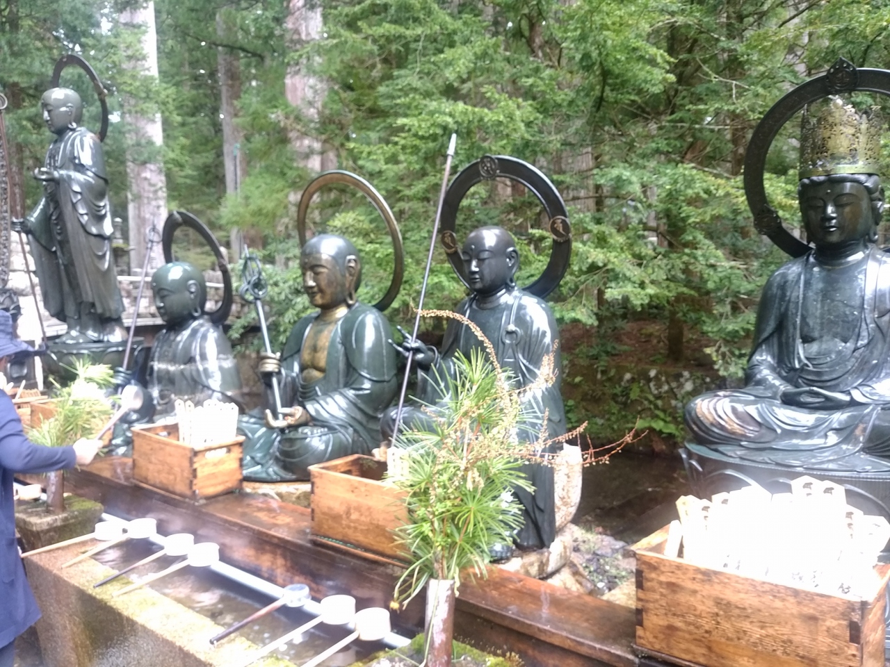 奥ノ院一の橋から入り中の橋の先にある松尾芭蕉の句碑を右折して英霊殿、御供所を観光して御廟橋右手前にある水向地蔵があります。参拝客が切れ目なく水をかける為か濡れて黒光りするお地蔵様が立ち並び、順番を待つ状態でした。この場所は「刈萱堂」で観た「石堂丸物語」の石堂丸が父の道心と初めて出会った場所でもあるそうです。又、先祖の戒名を書いた経木を御供所で購入して地蔵様の前に置いて先祖供養もできるそうですが、殆どの人(私達も含めて)お地蔵様に水をかけてお地蔵に手を合わせるだけでした。
