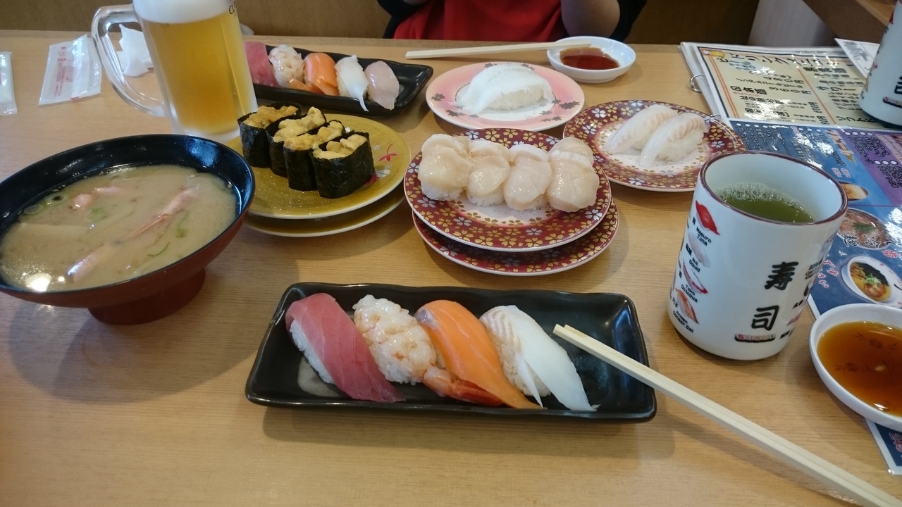 帰る前にお寿司が食べたいと思い探したが近くに寿司やさんがなくて、ANAホテルの前の回転寿司やさんに入りました。時間が2時頃だったためか、店内は空いていて回転コンベアには何も乗っていませんでした。直接板前さんが注文を取って握ってくれます。一番美味しかったのがホタテ。北海道の近海で捕れたものをえらんで頼みました。長崎や三陸の直送のものもありましたが、せっかくなので北海道の近海にしたいですね。うにがイマイチでした。480円のランチというのが5貫くらい乗っているのがあり、まずそれを食べてからお好みに行きました。ランチはとてもお得で美味しかった。総額は2500円ほど。お昼に回転寿司でも普通のお寿司やさんで食べる位はかかりますね。