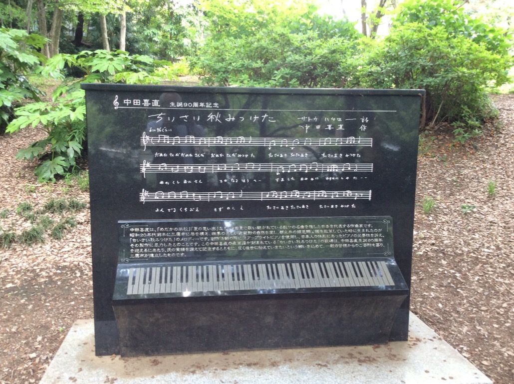 井の頭公園の井の頭池の南側の遊歩道にある歌碑です。鍵盤があつらえられているユニークな石碑で、外国人観光客もiPhoneを取り出して譜面通りに弾いてみていました。もちろん、「小さい秋見つけた」は知らなかったと思いますが、そんな気にさせる良い歌碑ですね。
