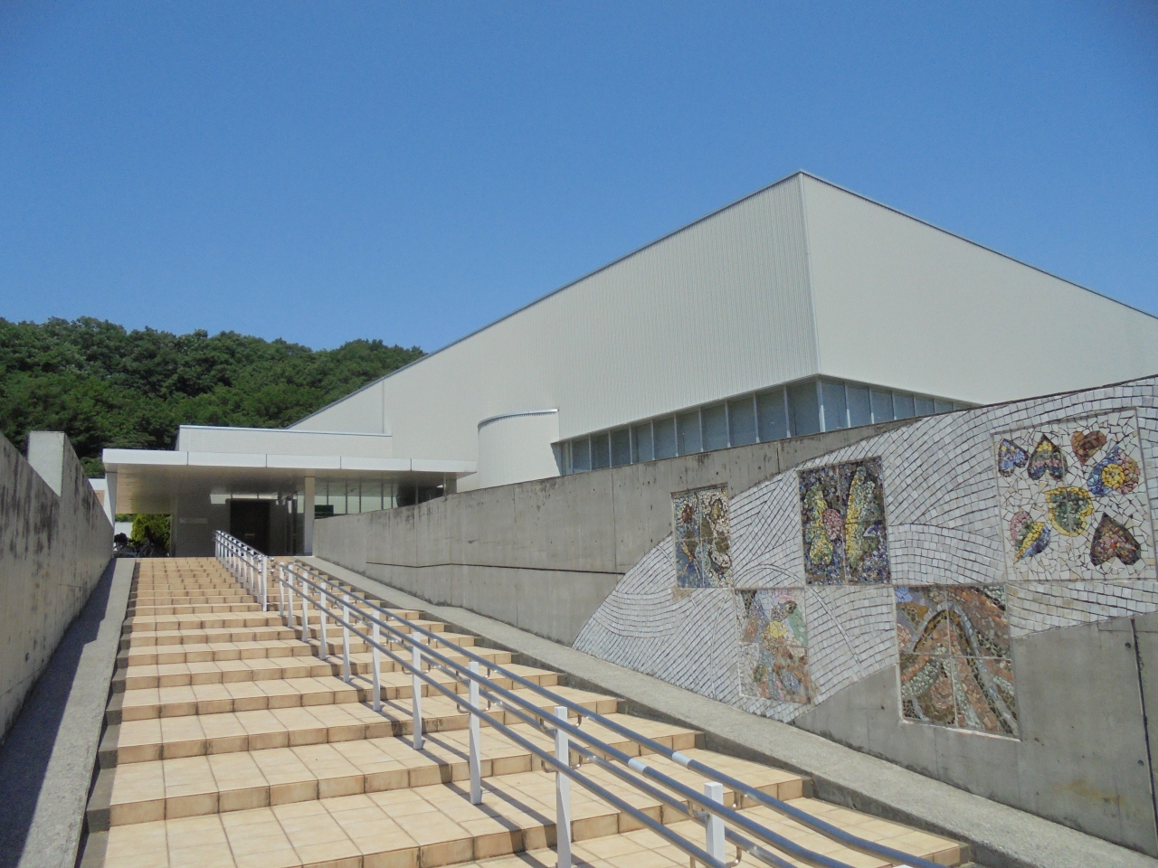 稲城市向陽台の城山公園内にある図書館。公園の緑を背景にした白い建物はまるで美術館のようです。