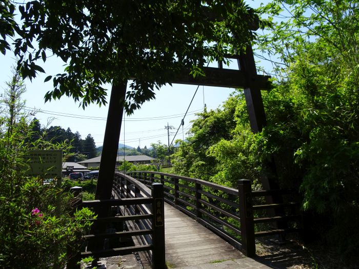 音止めの滝・白糸の滝の有料駐車場に車を停めて、滝に向かって進むと、その途中(左側)に皮を渡る吊り橋があります。
