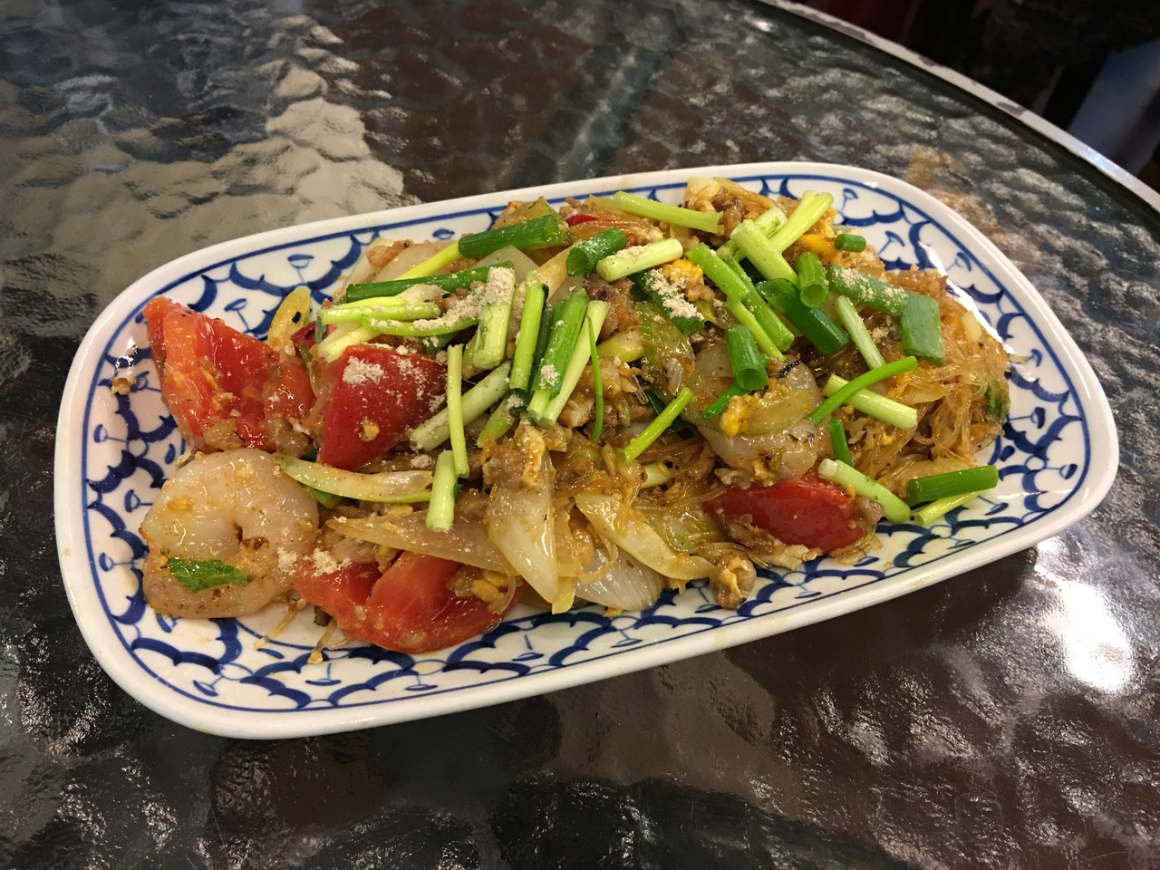 飲むためなので、食べた料理はつまみがわりのパッウンセンのみ。タイ風の春雨です。これがとっても美味しい。僕はチャーンビールを、友人はタイガービールを飲んでタイ気分。