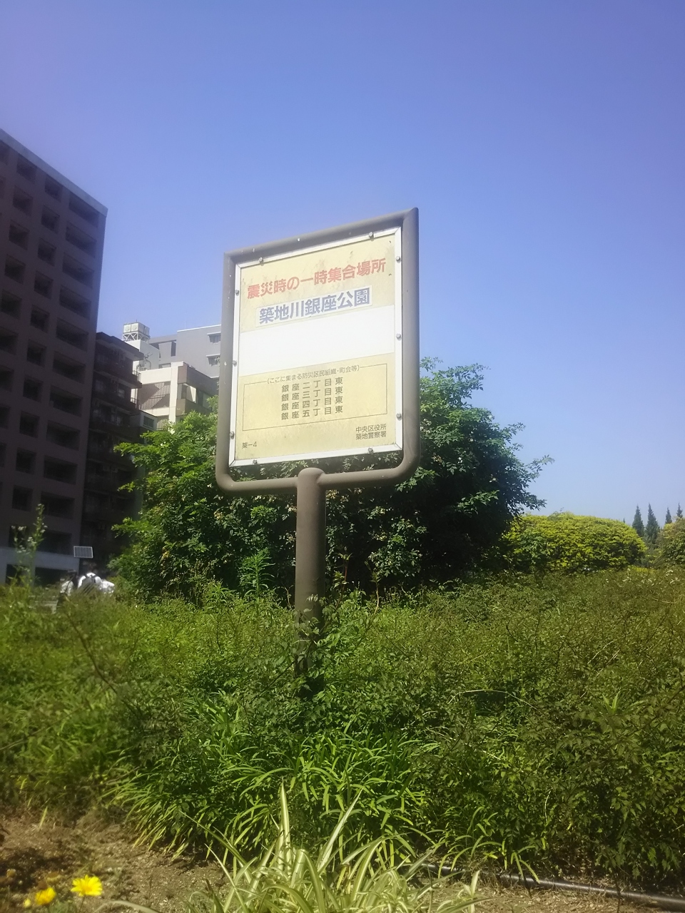 東銀座から築地に向かう途中にあります。公園ですが、昔の築地川の埋め立てた後に出来た、高速の上に架かる橋の公園になります。晴海通り沿いに左右に公園がありますが東側の公園の方がやや大きめにできています。椅子などで休憩もできます。