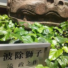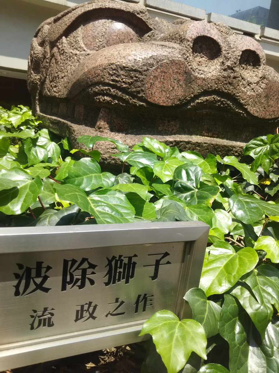 大きな獅子のオブジェで、築地のオフィスビルの1階にあり、あまりの大きさに驚きます。築地の奥にある波除神社もあります。ひとつのモニュメントになっております。全体が平たい感じですが、非常に有名な彫刻家の作品だそうです。説明用のプレートがあるので、一度見てみてください。