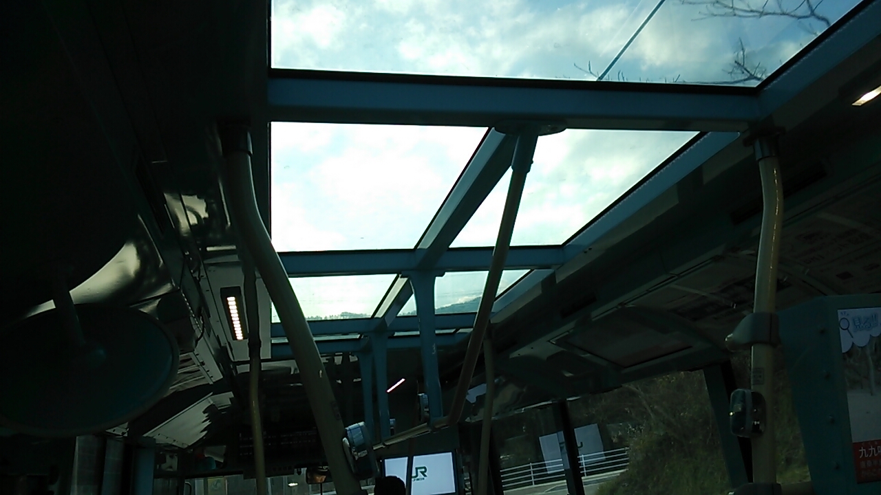 天井の一部がガラス張りになっていて、非日常感を味わうことが出来ますが、前寄りは2人掛けのベンチシート、後寄りは4人掛けのボックスシートが4ヶ所ありました。