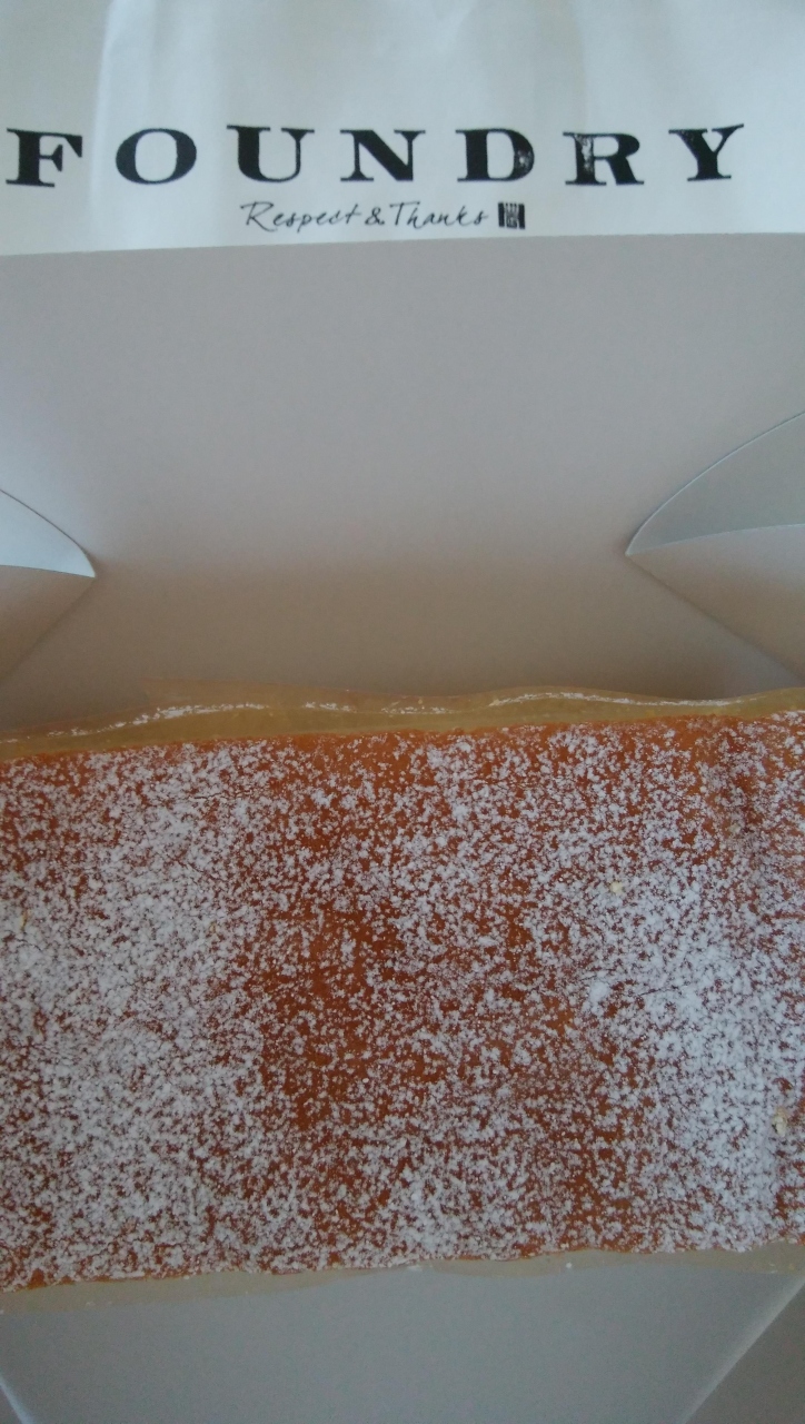 こちらは季節によってフルーツを買えるので、季節ごとにいろんな味が楽しめます。5月はメロンとパインを使ったお菓子です。あと卵にこだわっているので平飼いたまごのカスタードプリンとかも販売。平飼いたまごのプリンをサンドしたケーキ1本を972円(税込)を購入。カスタードプリンと生クリームをカステラのような生地ではさんだものです。フルーツは入っていないですが、6-7名でカットできる大きさです。