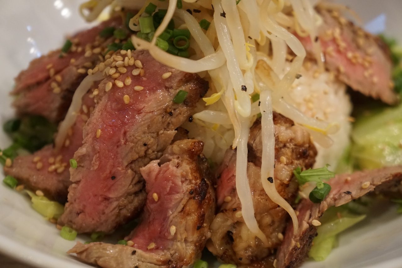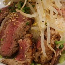 肉屋の台所は、尾久橋通りを西日暮里の方に少し歩いたところ。人通りは少ない辺りです。いただいたのはステーキ丼。酸味のあるソースをたっぷり掛けて、なかなかパンチがありますね。意外に肉のボリュームもあって、お腹いっぱい。これなら、誰でも満足できると思います。