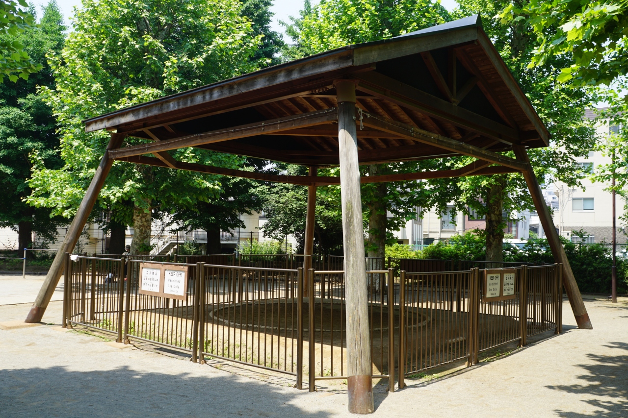 金王相撲跡は、渋谷氷川神社のふもとの公園の中。屋根の付いた相撲場です。氷川神社から降りてくる途中に案内板があって、かつては祭日だった9月29日にはここで相撲が行われたそう。本職の力士だけでなく、近郷の若者も多く参加していたようです。