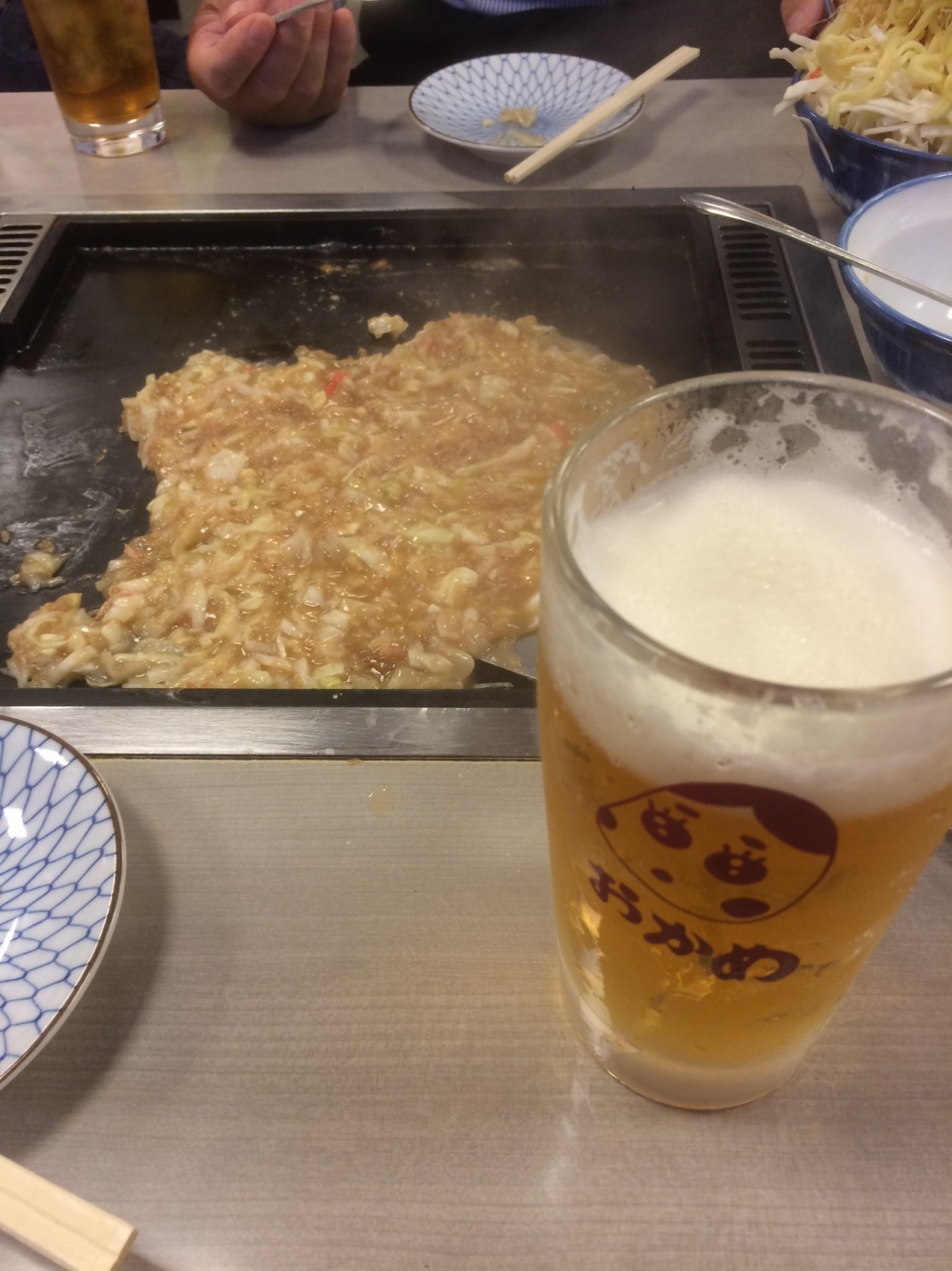 平日の13時過ぎに行きましたが修学旅行生が多くもんじゃストリートにある有名店は満席のところが多かったです。こちらのお店は入ることができましたが14時にラストオーダーとのことでした。ビールはプレミアムモルツでジョッキ大きめ。700円です。