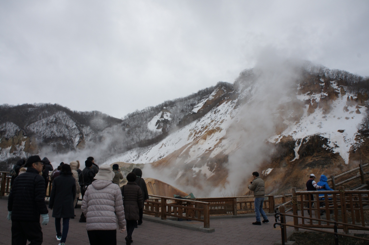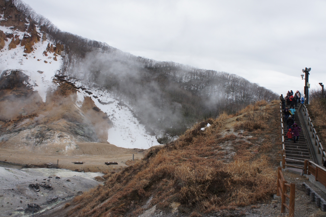 登別温泉のすぐ近くにあります。駐車場からは歩いて2分くらいで地獄谷に着けます。散策路まで行くと硫黄の臭いがきつくなります。白い煙が地肌もろだしの谷からいくつも立ち上っています。硫黄の煙が上がっている所には草木一本生えておりません。この谷をバックに記念写真を撮る観光客が大勢いました。