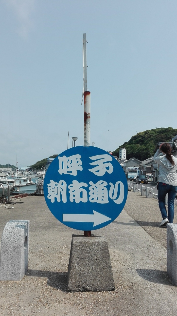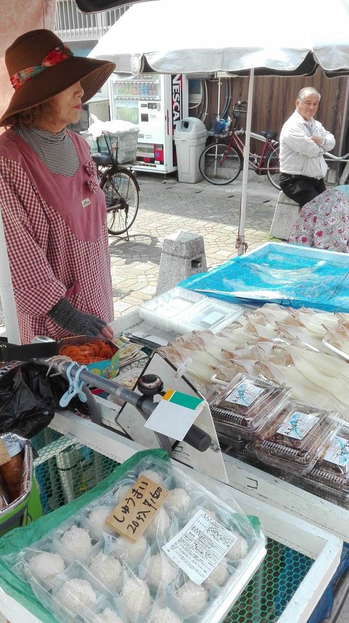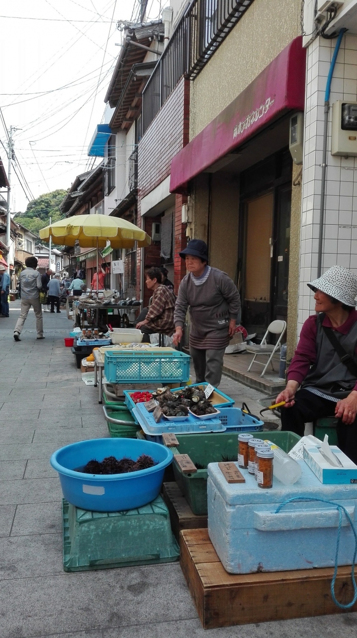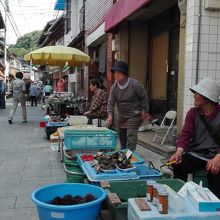 朝市通りには、とれたての魚介類や干しイカ、野菜などなどを販売するおばちゃんが元気な声で「安いよ、買っていきなぁ。」と朝市通りを通る観光客などに声をかけていました。
