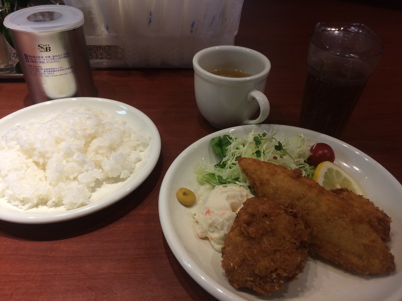 本日の日替わりランチはミックスフライ 白身魚のフライをはじめとしたフライ数種類にライスとスープ、これにフリードリンクが付いてくる。