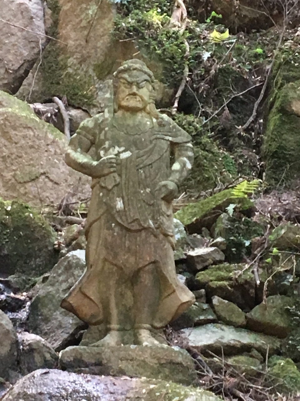 九体阿弥陀如来様の素晴らしさは言うまでもありませんが、奥之院に不動明王があります。山門を出て、道路を下って行くと、左手に細い小道があり、竹林を下って小川を渡ると、崖に三体の石像がありました。徒歩で15分ぐらいかかり、帰りが登りて大変ですが、時間があれば、山中の不動明王も神秘的です。山中なので、複数人でとの表示がありました。
