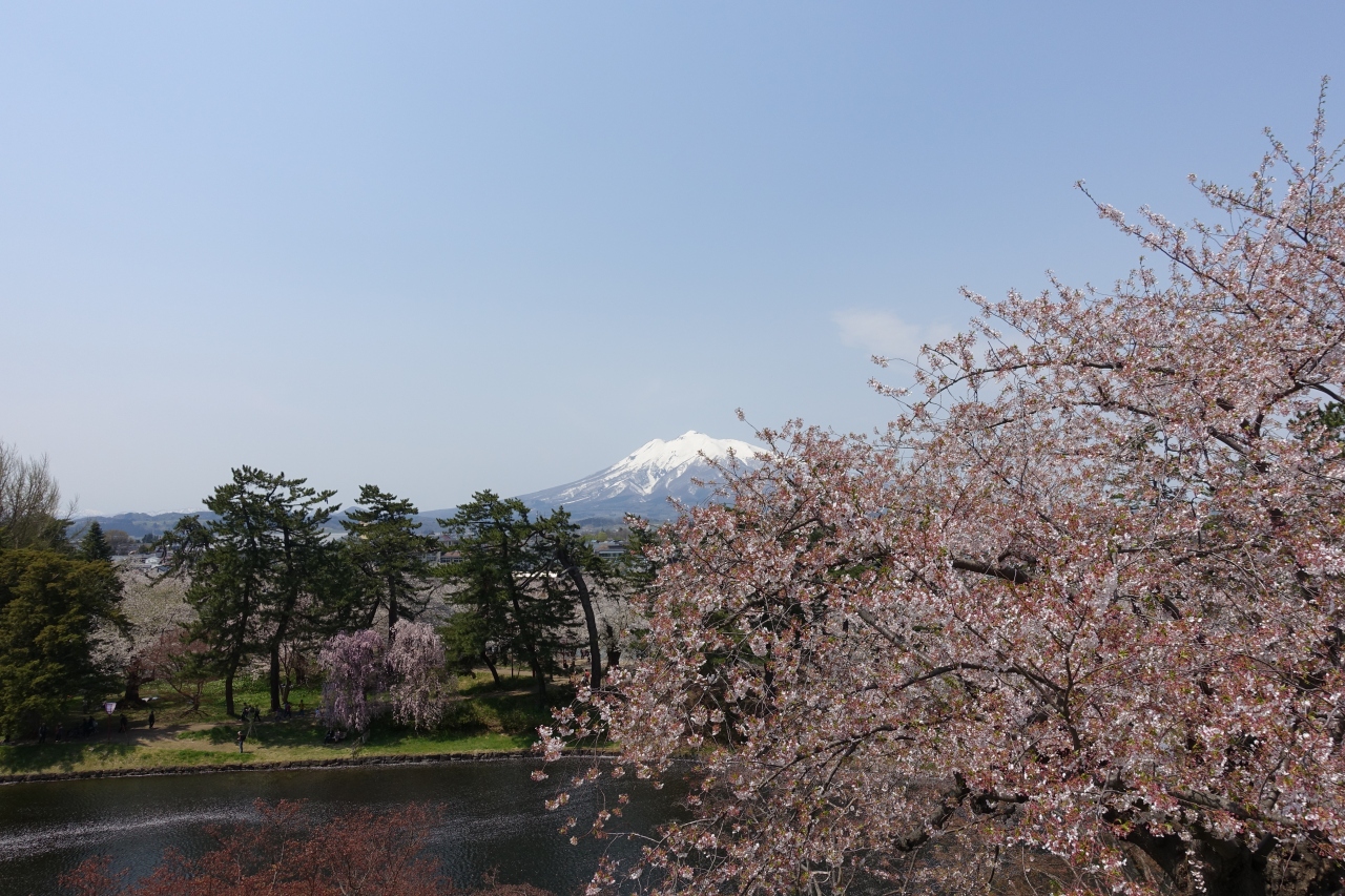 弘前公園にある弘前城の天守閣前からの岩木山の眺めは見事です。天守閣のある丘から、岩木山の方向は外濠の崖になっているため、この方角には遮るものがなく、岩木山をくっきりと見ることができます。外濠の水とのコントラストも美しい光景です。