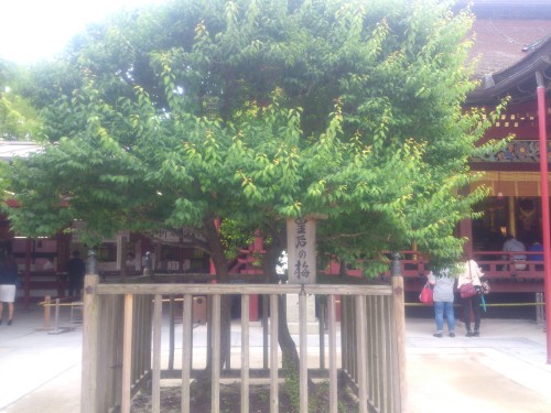 太宰府天満宮の社殿前に位置し、向かって左側にある梅の木です。右側にある飛梅のように菅公にまつわるエピソードがあるのかと思いましたが、大正天皇后が植えたというだけの名前のままの梅でした。5月に訪れたので、花もなくただ葉が茂っていました。