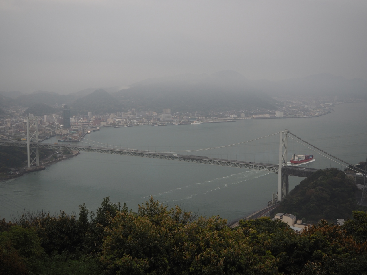 火の山公園に上ることができるロープウェーです。山の上からは関門海峡が一望できます。ロープウェーの山頂駅の横に展望スペースがあり、ここからの眺望が一番きれいでした。山頂のレストハウスは長らく工事で休業しているようで、その周辺からは木々が邪魔であまり眺望がよくありませんでした。