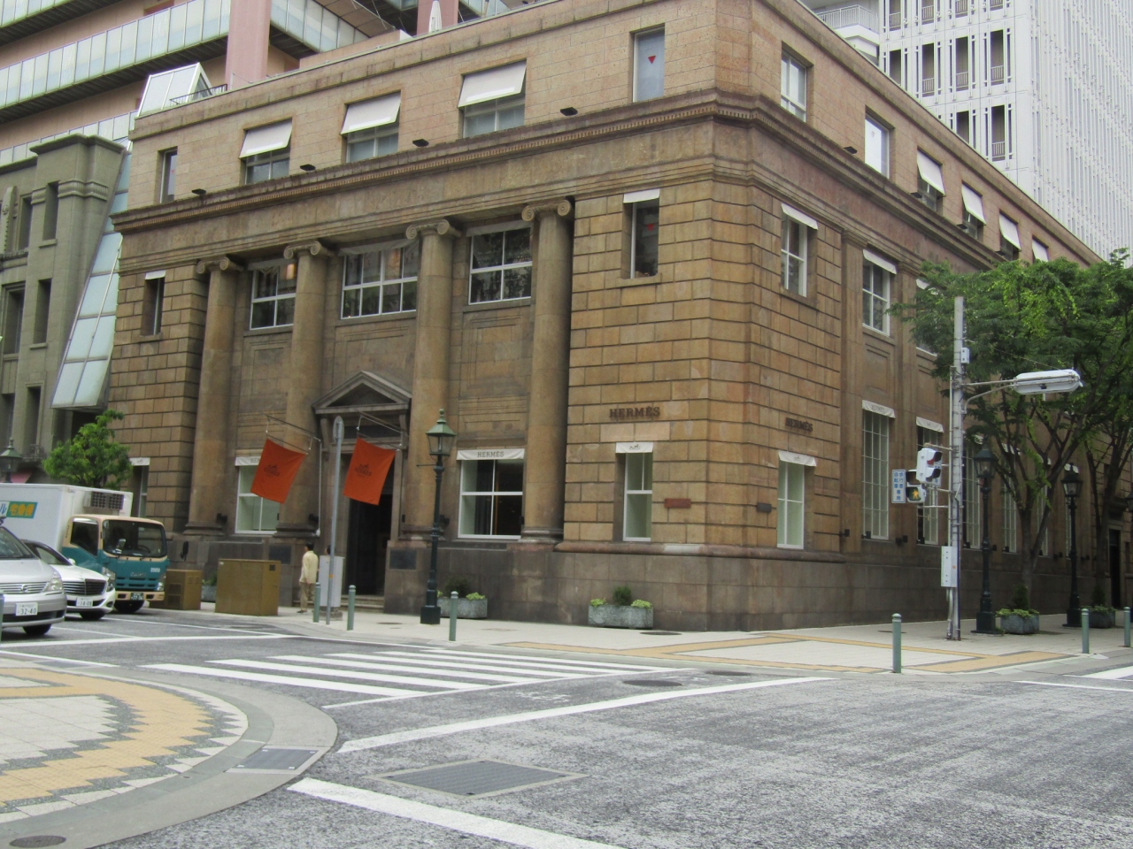 高級ブランドのエルメスのお店が居留地にあります。旧居留地38番館のビル内の1階です。こちらは茶色のどっしりとしたビルです。店内の高級感ととてもマッチしていると思います。