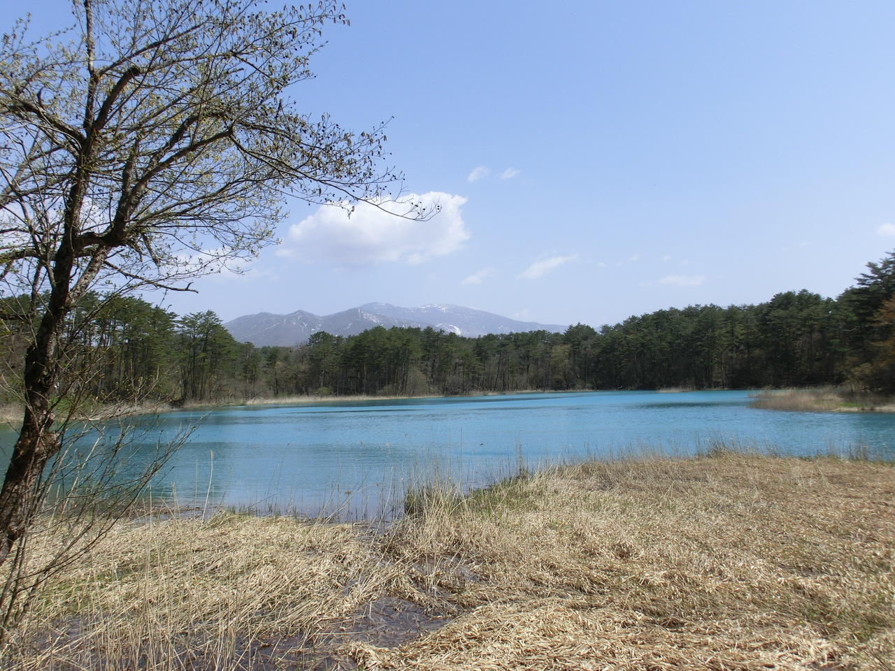 とても美しい色の沼の景色が楽しめます。春に訪れると、足下の草がまだ茂っていないし、木々の葉も茂っていないので、遊歩道からの見通しが良く、沼の美しさを堪能できます。遠くに見える雪が残る山とのコントラストも良いです。