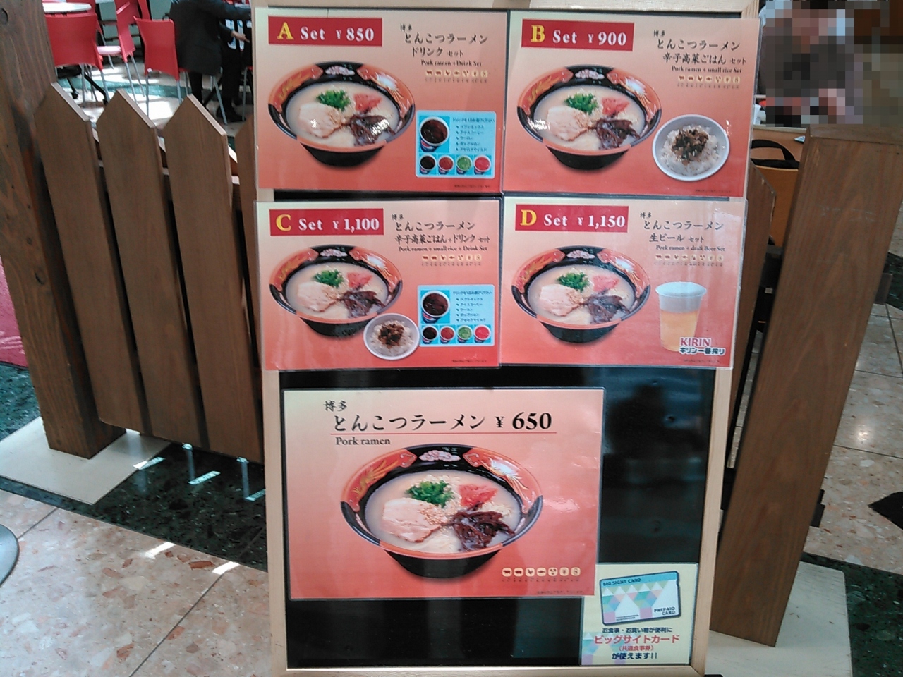 とんこつラーメンのお店、とんこつラーメンの単品は650円です。器は使い捨ての模様ありの発泡スチロールの器です。ちょっと味気ない器と思いましたが、とんこつラーメンは普通に美味しいです。また、替玉が100円であります。イベント会場としてはまずまずの食事です。