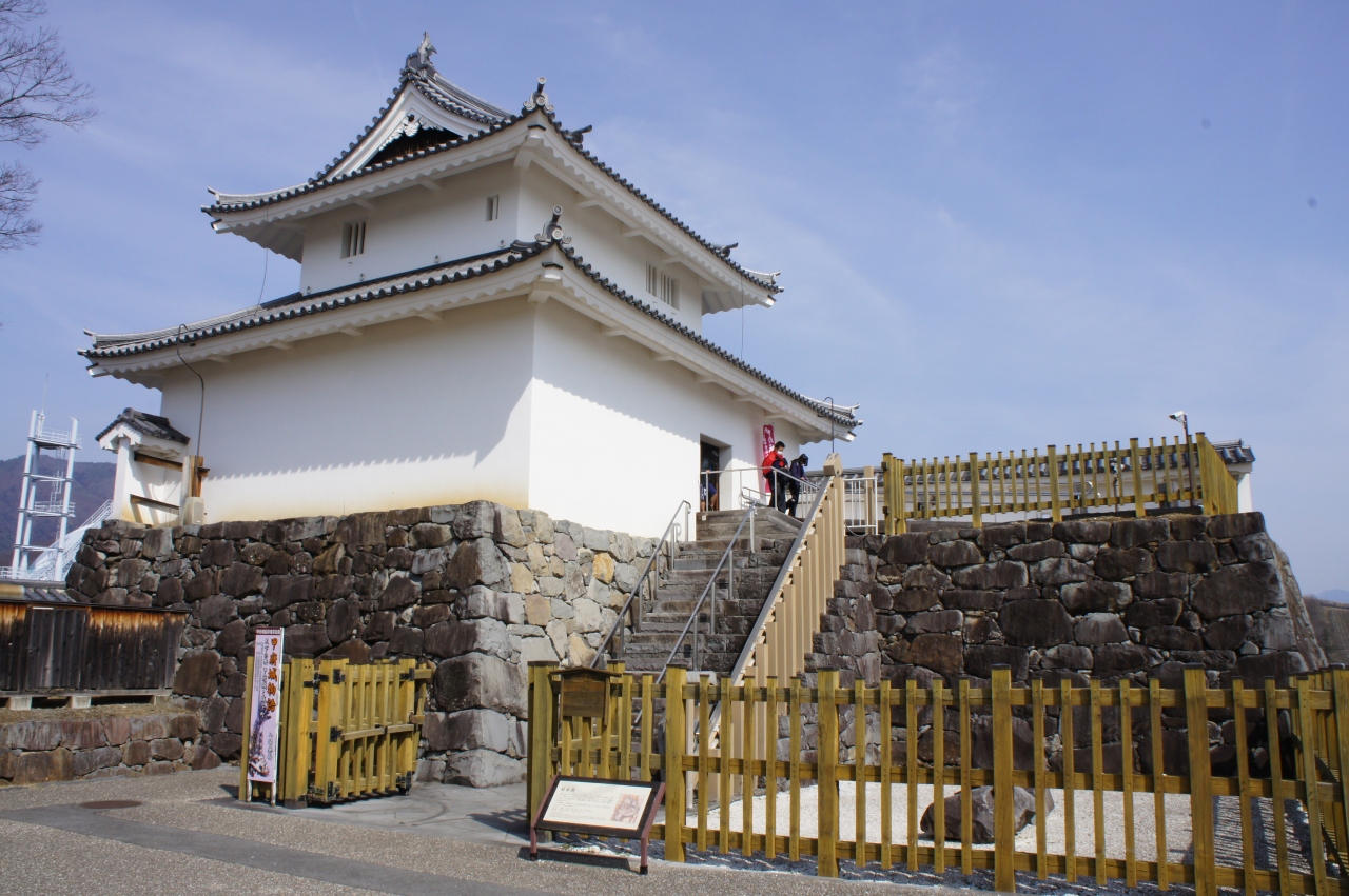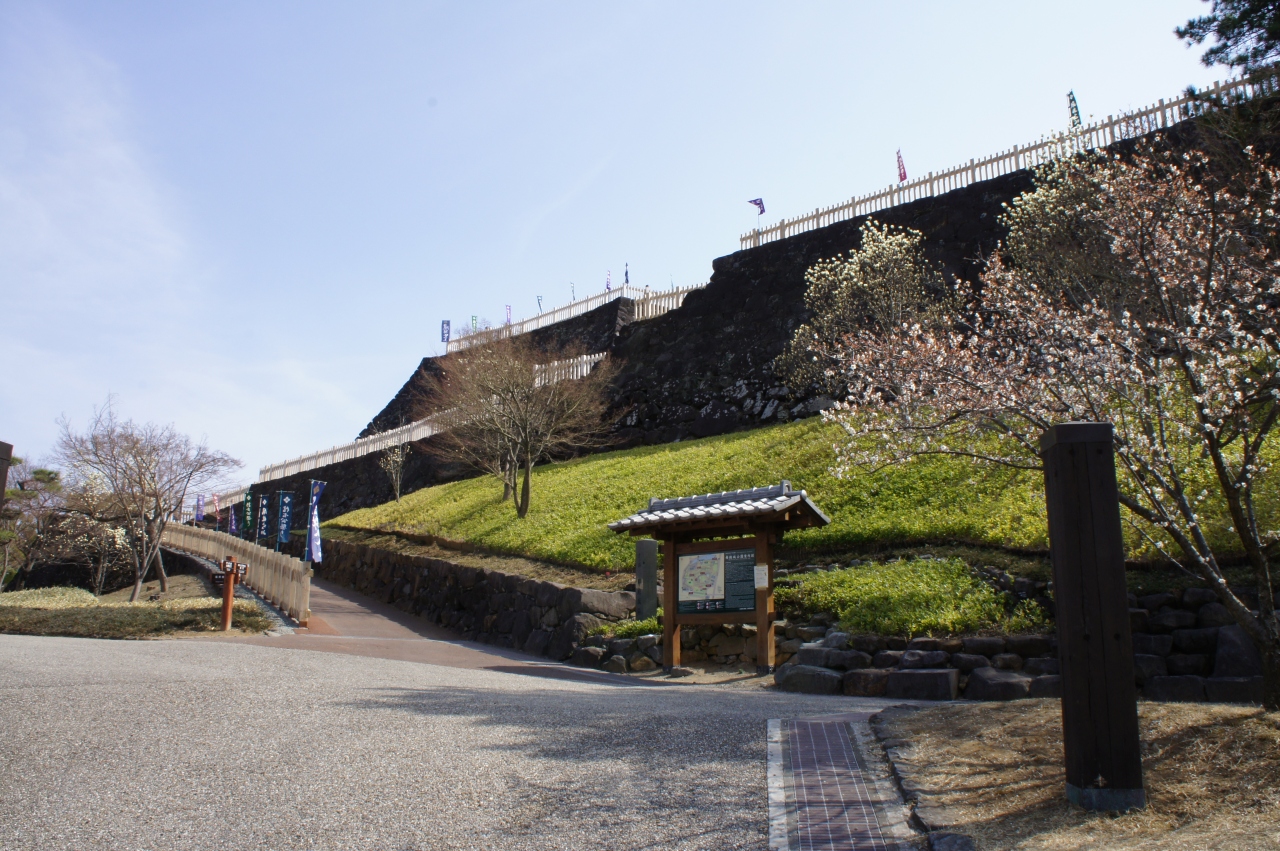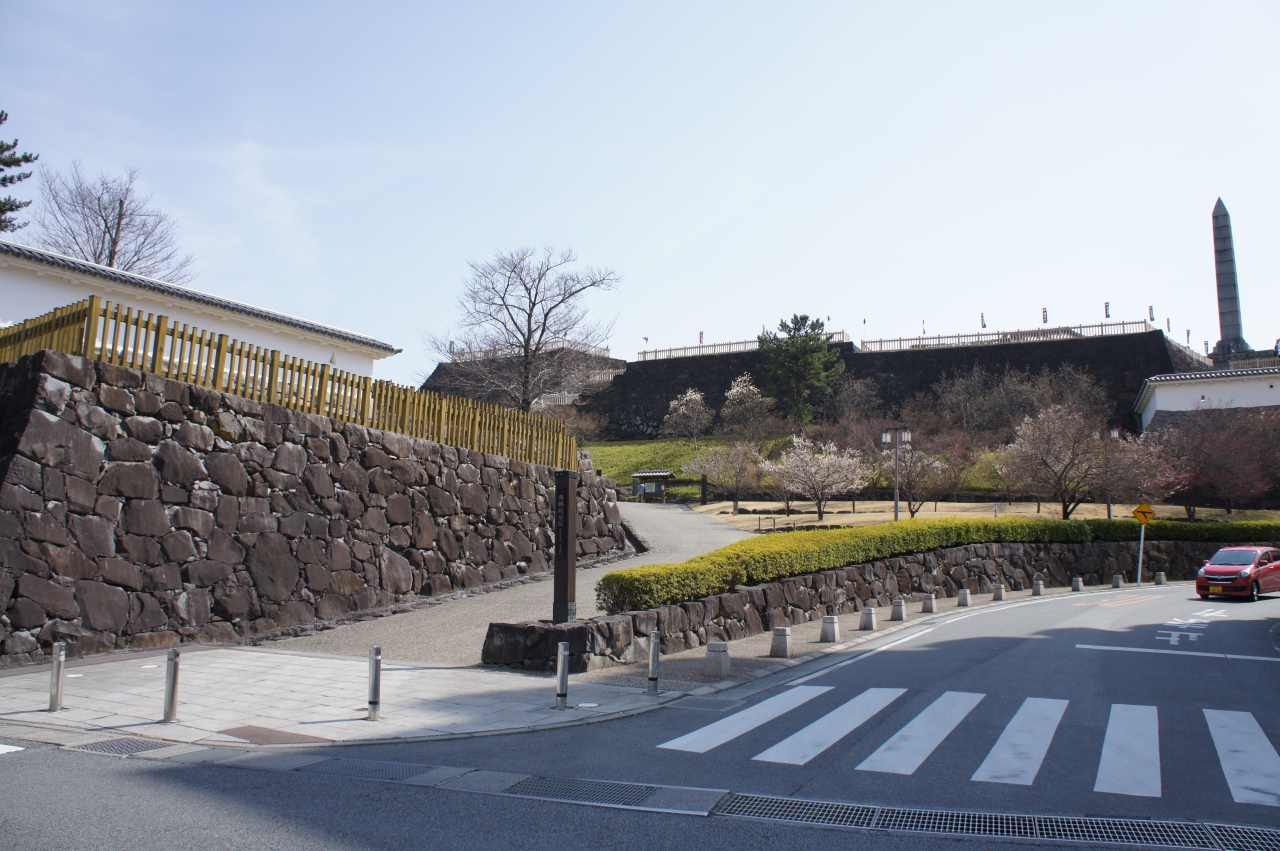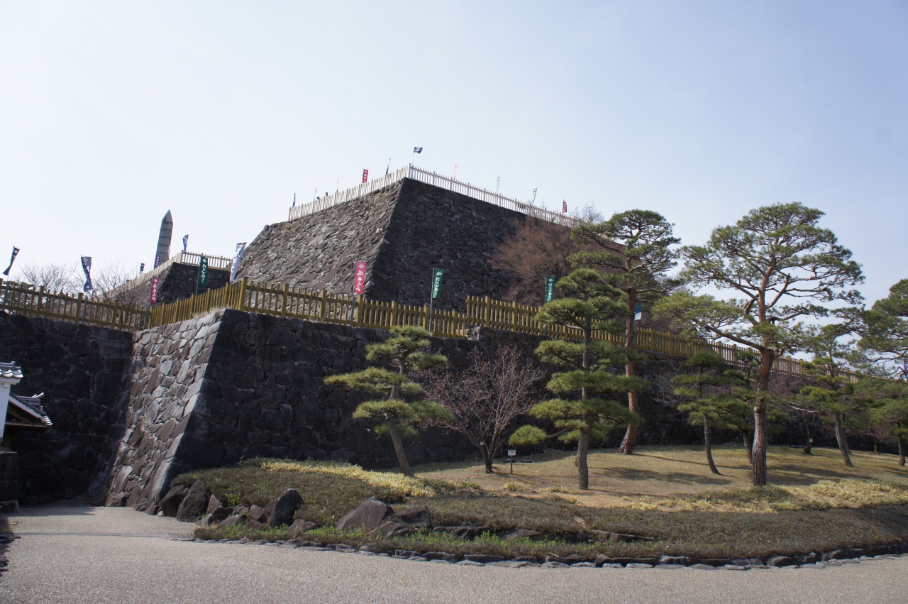 青春18きっぷでJR甲府駅まで来ました。駅から徒歩で10分ほどで甲府城跡がある舞鶴城趾公園に着けます。入り口からは緩い上り坂になっていて、周囲にある桜はちらほら咲きになっていました。途中、古い井戸や稲荷櫓があります。稲荷櫓は無料で中に入ることができて資料館風になっています。お城に関わる展示資料がいっぱいあるので、ぜひ観覧することをお勧めします。ここから天守台まで5分で着けます。天守台は展望台風になっていて、ここからの眺めは360度眺められるパノラマになっています。特に、南側に見える富士山は、晴れた日には7合目から上がよく見えます。すぐ右側にある電波塔?が少し目障りですが、富士山がよく見えるだけで十分でした。