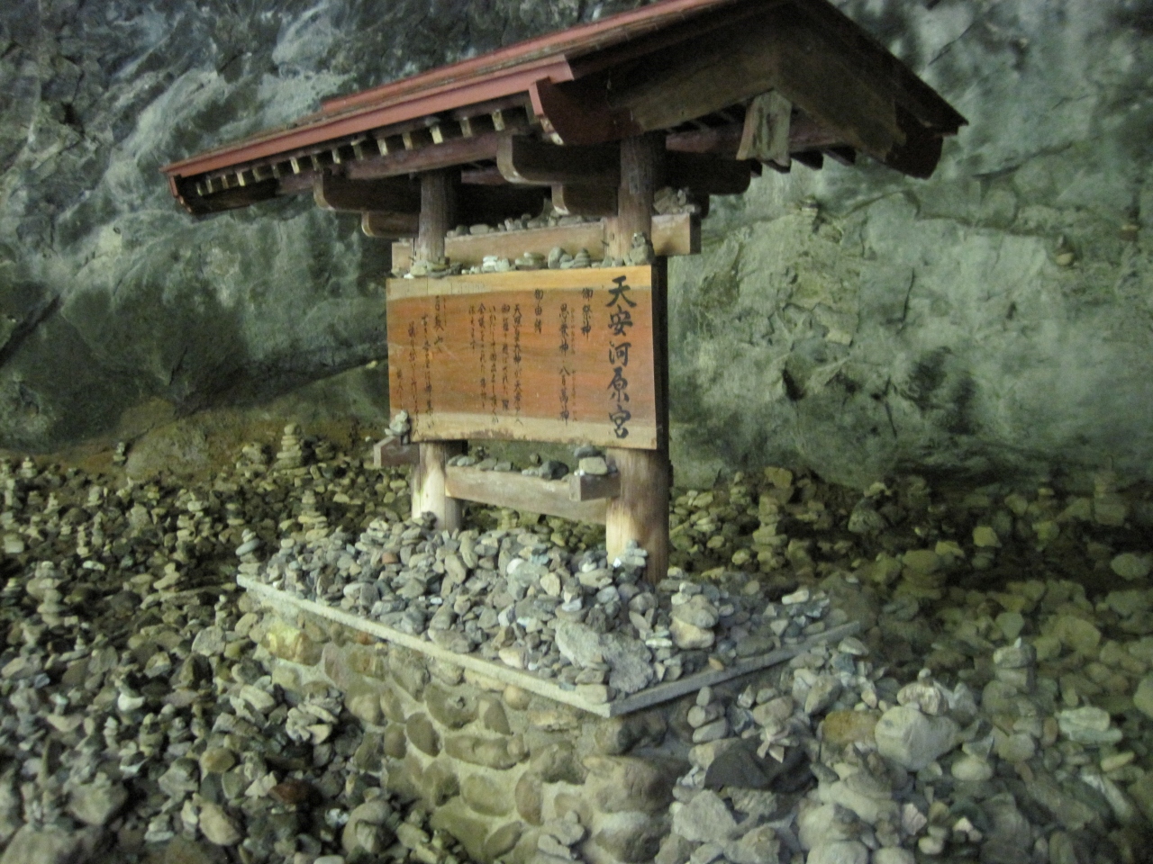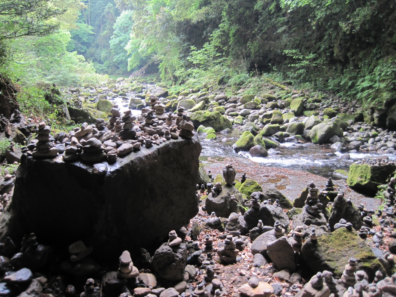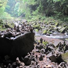 賽の河原を思わせる積み石に囲まれた鳥居は清廉な空気と水の音が合わさって神聖な空間です。一人で行くと少々怖く感じるかもしれません。