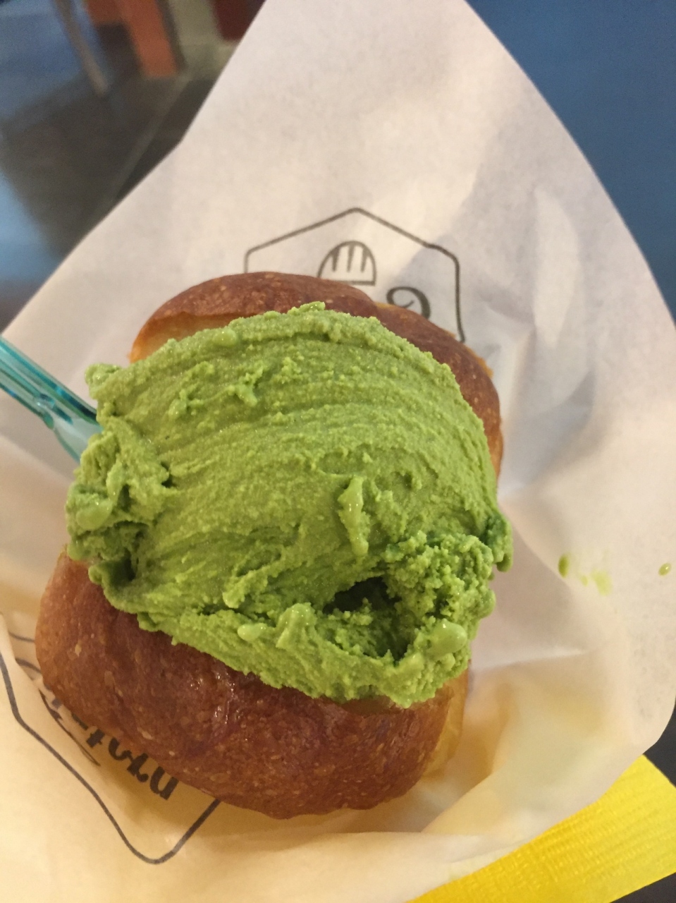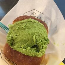 選んだジェラートは西尾の抹茶ジェラートで、柔らかなパンでジェラートを挟んでくれます。