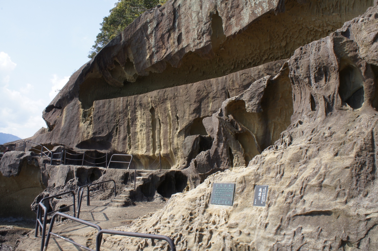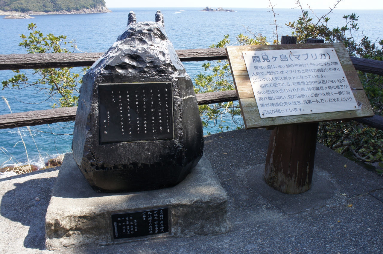 青春18きっぷを利用して鬼ヶ城へ行きました。JR大泊駅で下車、徒歩20分で鬼ヶ城に着けます。駐車場の広場には水産物直売所があり、ここで人気のさんま姿寿司を買い遊歩道の手前で昼食タイム。遊歩道の入り口には「トトロ」風のオブジェが立っています。奥には鬼ヶ城の姿が見えます。名前の通り、鬼が住んでいる城のようです。荒々しい奇岩が続く遊歩道をずっと歩いて進みます。途中、道幅が極端に狭い所もあり、高低差がある険しい遊歩道を歩くにはある程度の度胸が必要です。遊歩道から見る海の景色や、所々にある「鬼の・・・屋」などという岩の造形美には圧倒されます。東口から続く遊歩道は一時間ほど歩いて西口に着けますが、西口はお土産屋や食事処など賑やかなものは何もありません。寂しく鳥居が建っているだけでした。