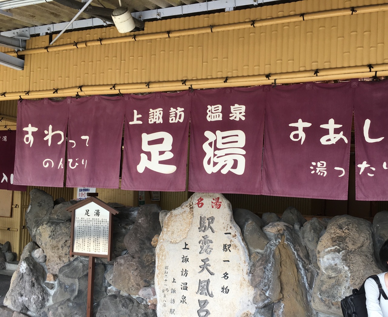上諏訪駅一番線にある足湯。信濃の観光を済ませ、新宿方面へ戻るギリギリまで、足湯を楽しむことができます。時間がない場合には、足湯向かって右側に源泉が出る蛇口があり、手をつけることもできますのでオススメです。