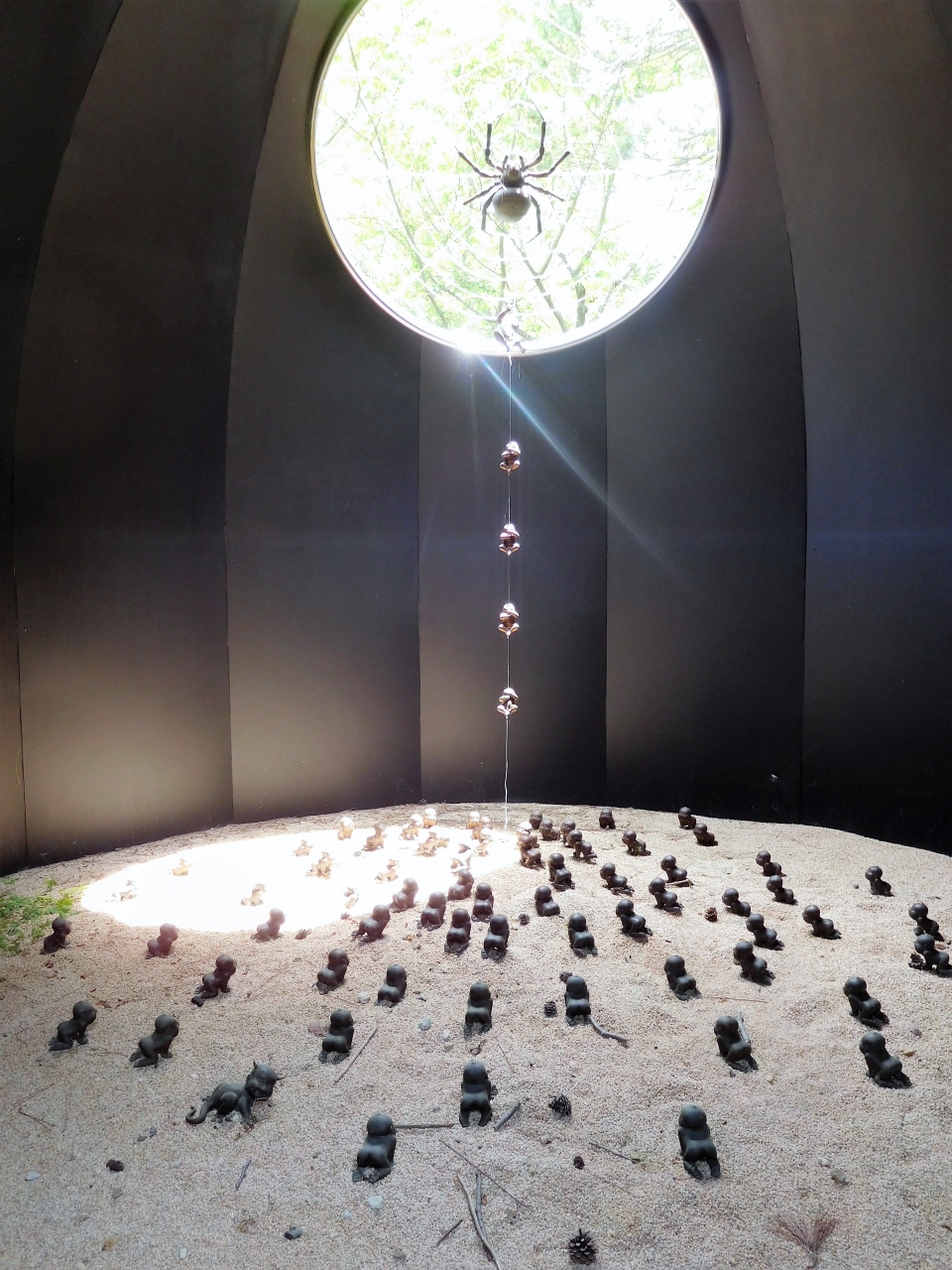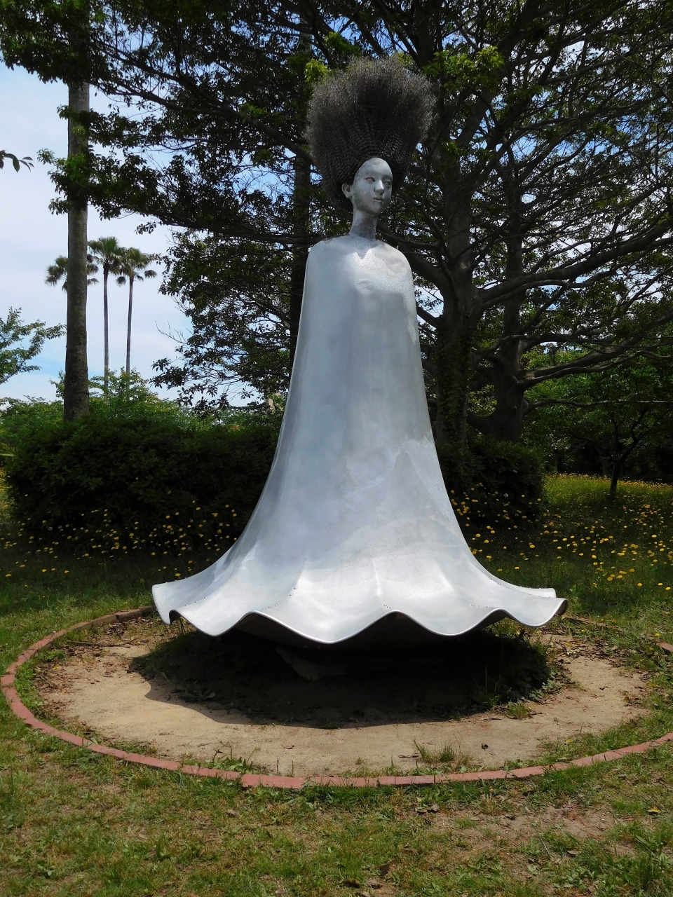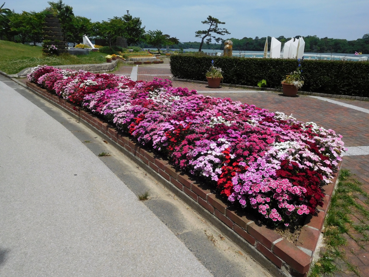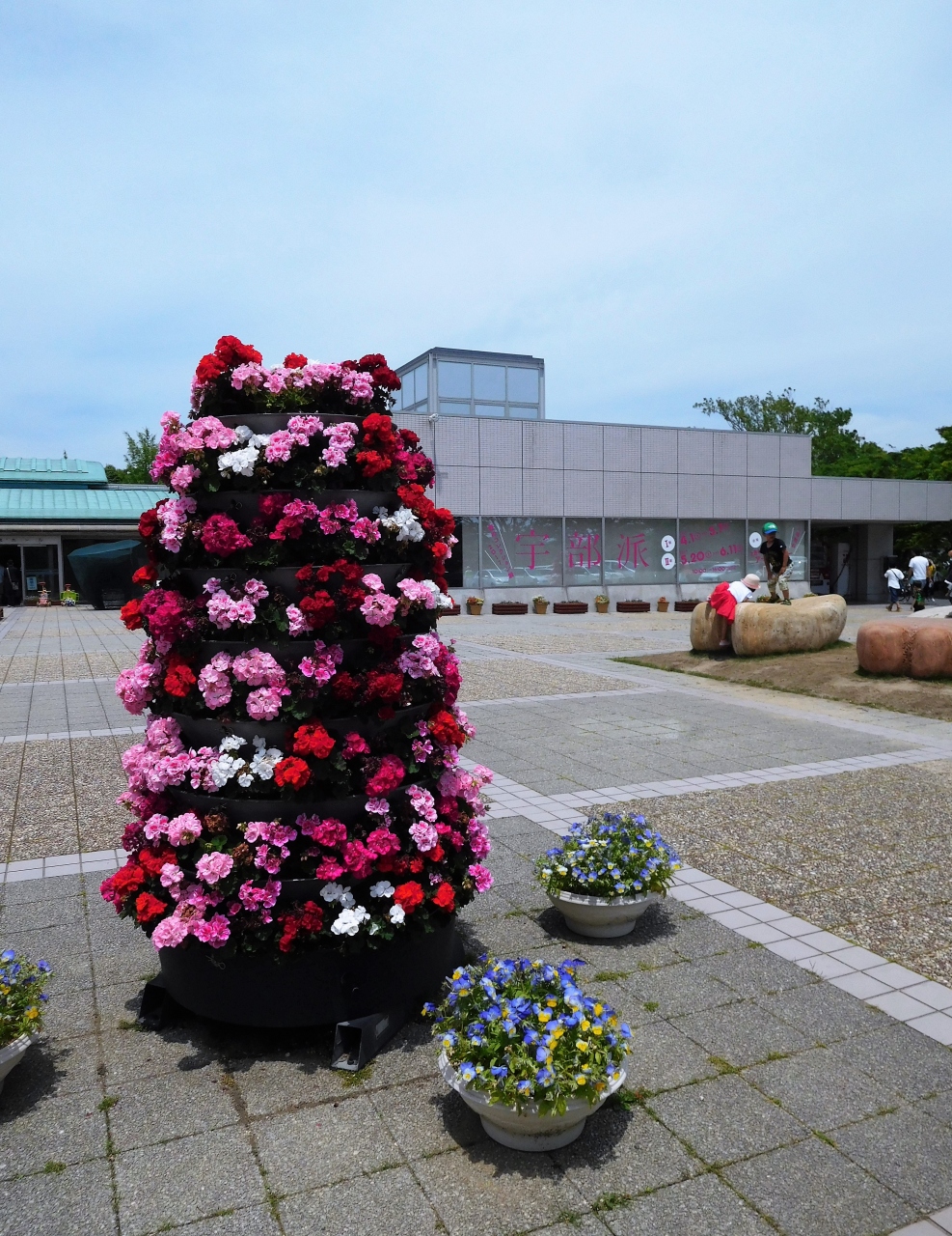 湖水ホールで彫刻展の説明を見たり、園内で彫刻やバラの花を見ました。