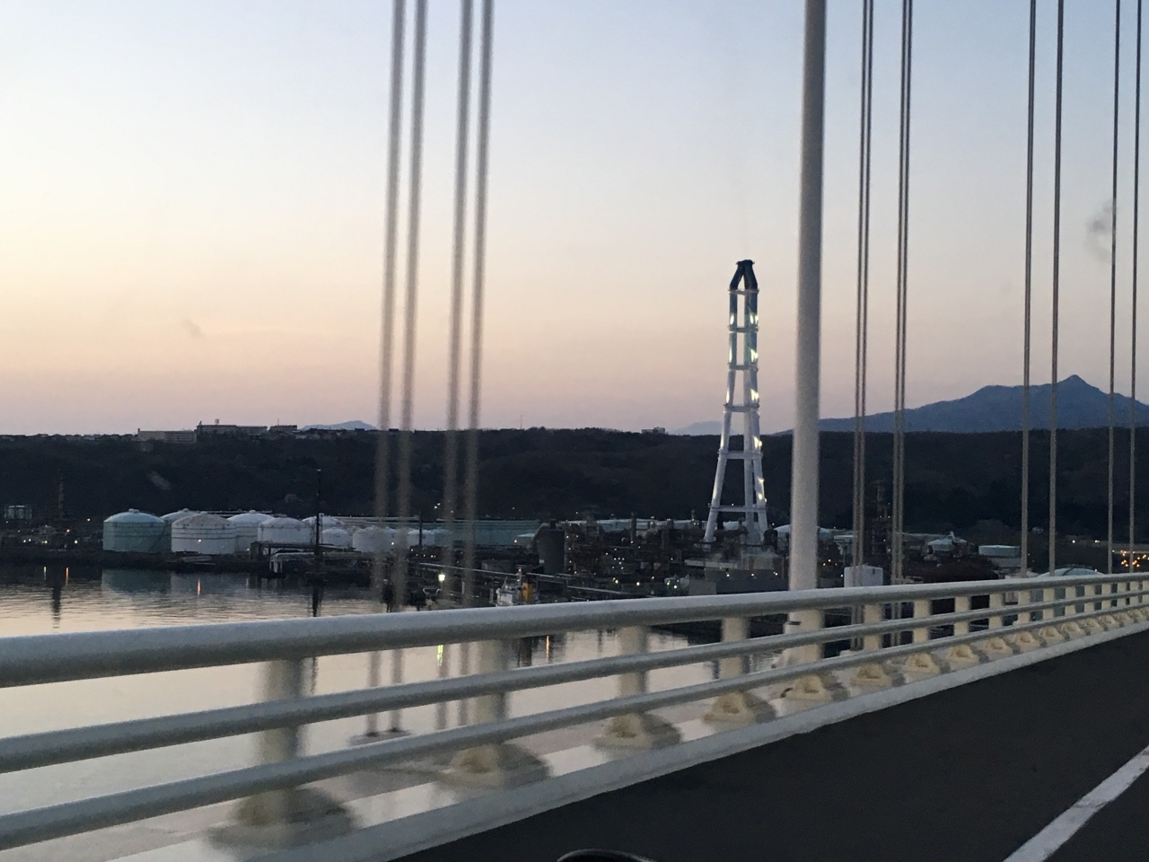 丁度、薄暗くなってきたので、工業地帯に明かりが点いてカッコよく見えました。