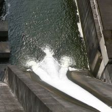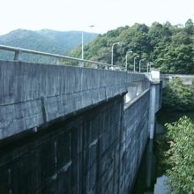竣工が1978年と比較的古く、クレストゲートがあるシンプルな構造で、ダム堤体上は車も通行が可能です。高さが55mしかないのでダム堤体上から下流側を覗いてもそれほど迫力はありませんが、オリフィスからはしっかり放流している姿が観えました。右岸にダムの諸元が記載されたプレート(添付写真参照)がありますが、構造など詳しい説明板があればよいのにと思いました。