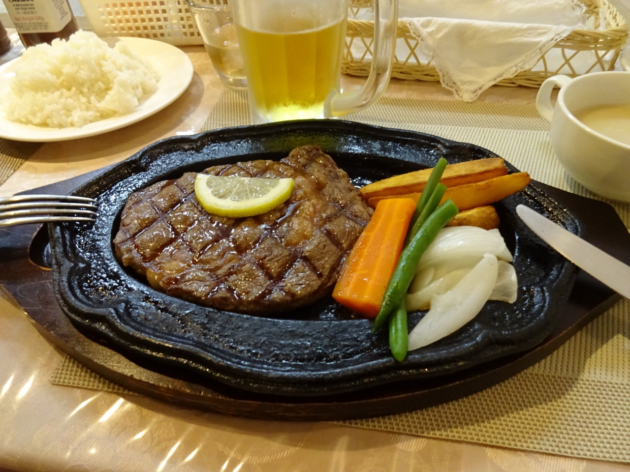 肉は比較的柔らかめでしたが、厚さが1cmほどとそれほど厚さはありませんでした。おそらくファミリーレストランのステーキ並みのサイズです。