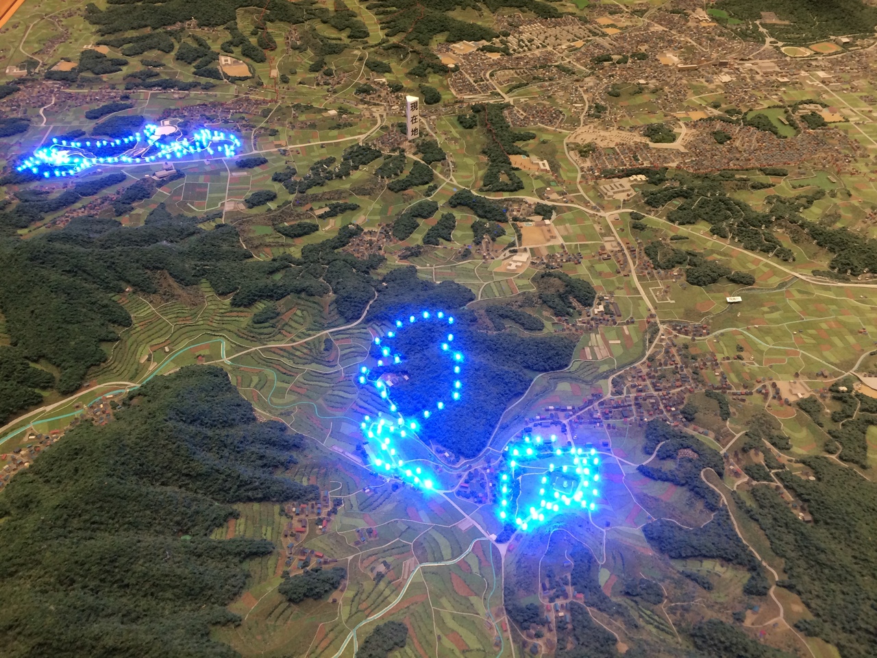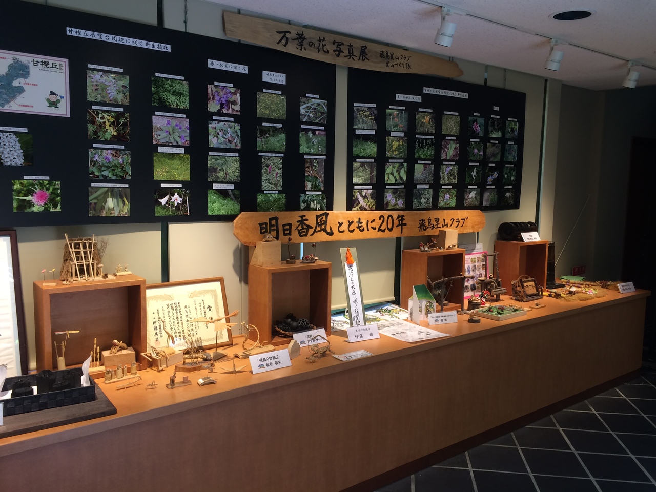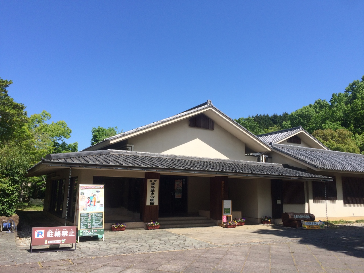 駐車場や駐輪場もあり駐車場には警備員もいました。石舞台古墳と並ぶこのエリアの大きな駐車場でした。館内に入ると明日香の模型があり、主要スポットのボタンを押すと光るので位置がわかり良いです。明日香の写真が多く展示されていました。