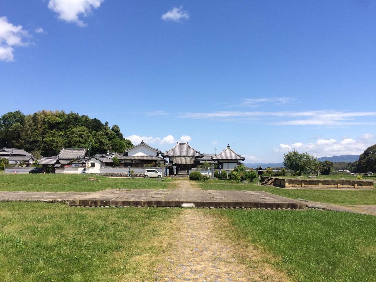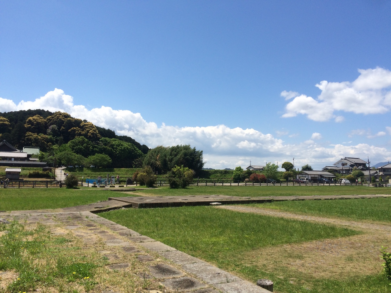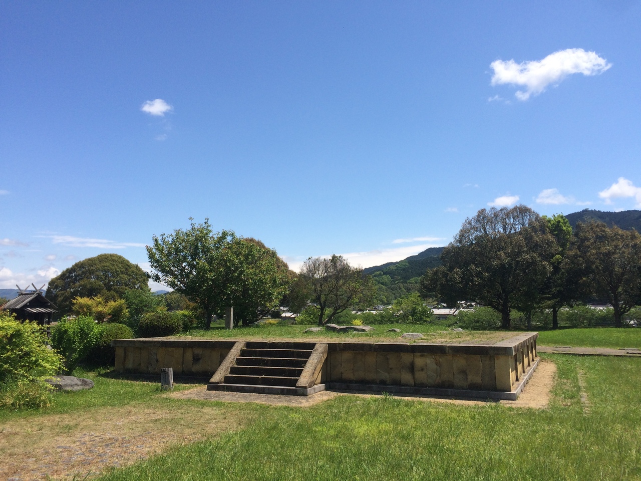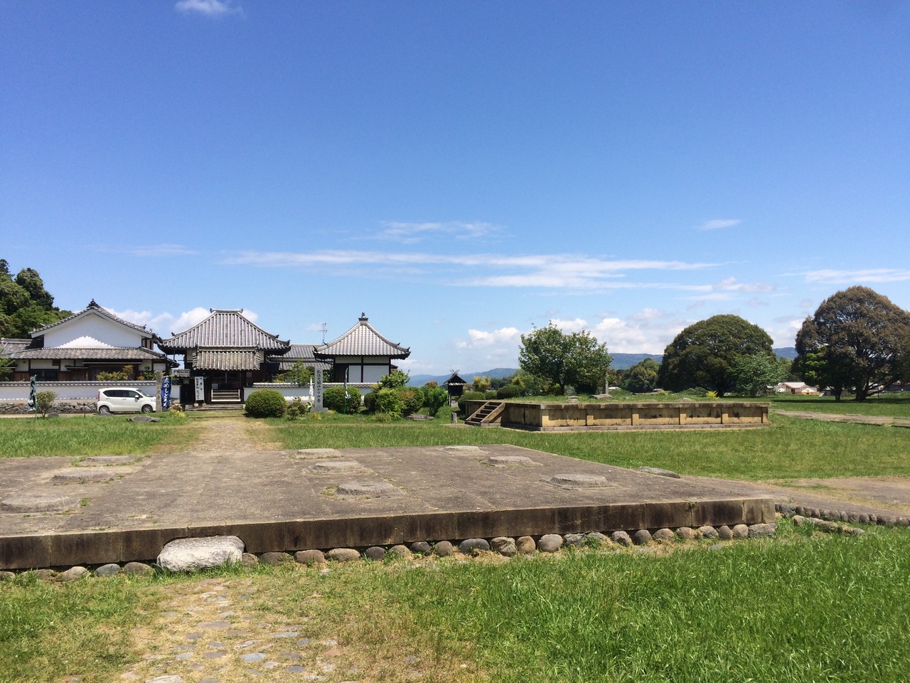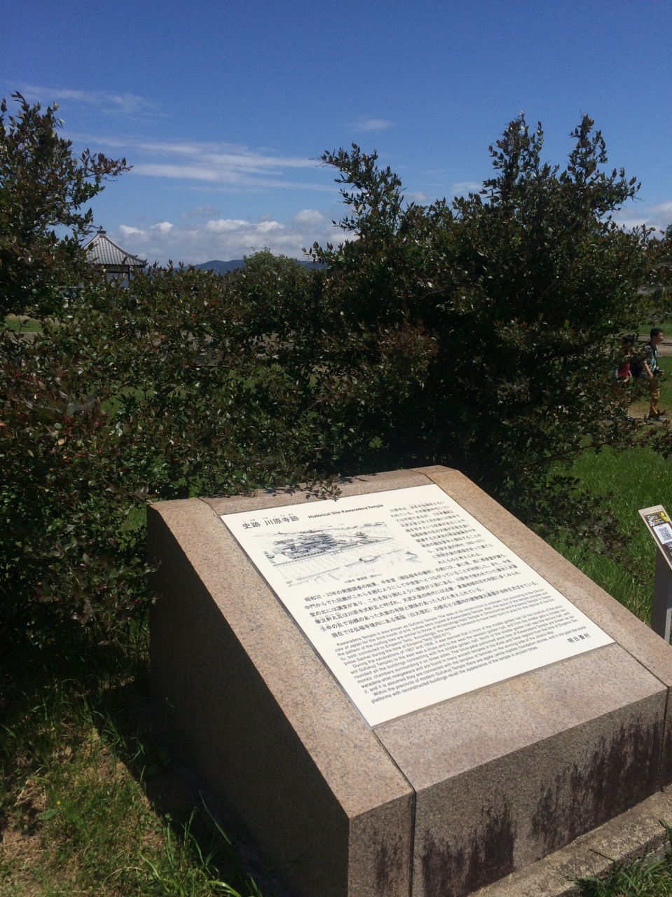 土台があるのみですが迫力があり大きな跡で土台の周りは芝生のようなものが生えていました。石碑も立派で土台には柱を支えた後でしょうか、丸い跡がいくつかありました。土台の後ろには川原寺があります。土台だけ見ると舞台のような感じに見えました。