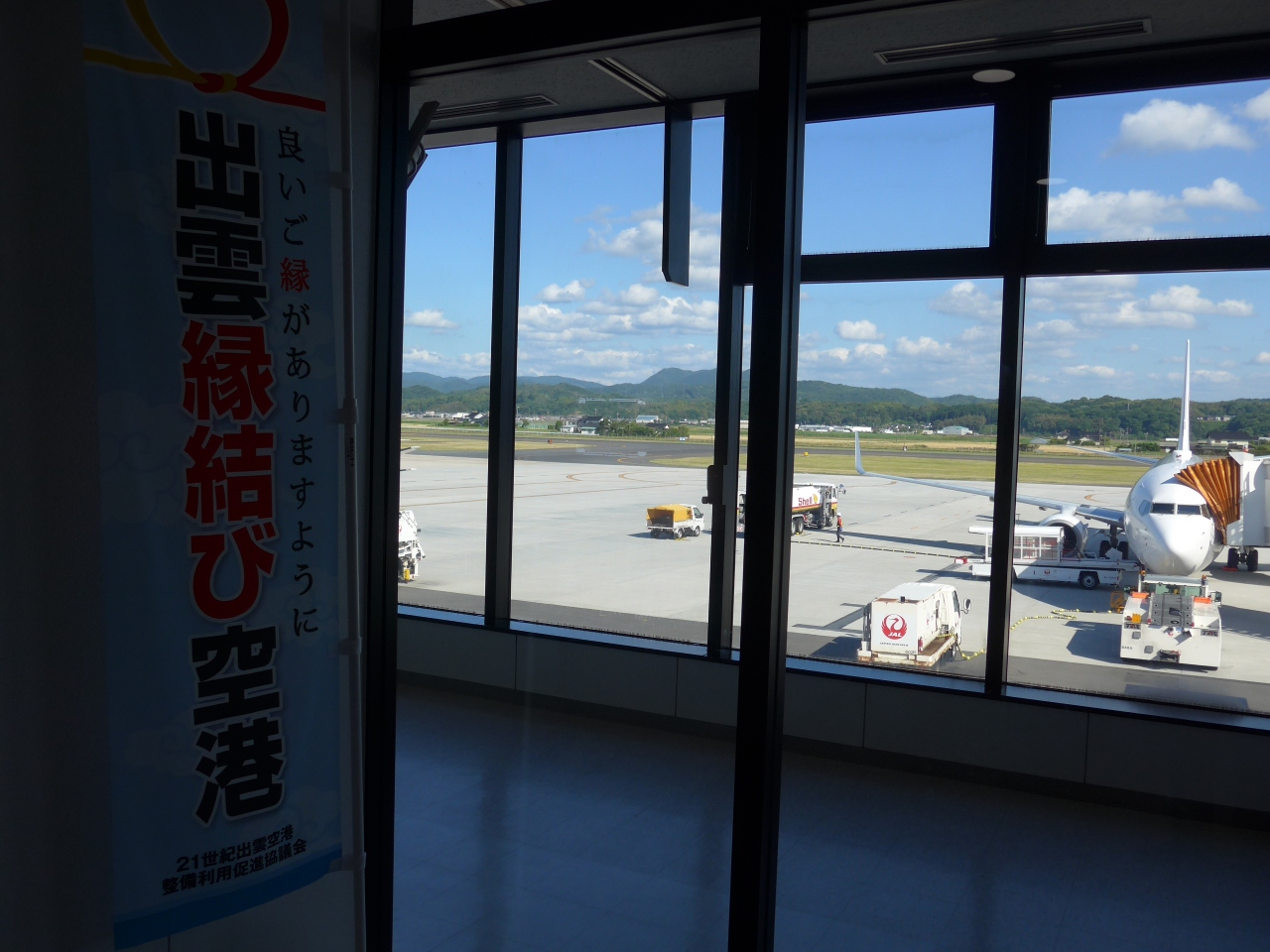 島根県出雲市での所用があり羽田空港からJALのジェット機で約一時間二十分で到着しました。羽田からはジェット機ですが到着していた機材が二機ありましたがプロペラ機でした。空港は滑走路の橋は海に面していて到着する際にはとても奇麗な風景が見えます。
