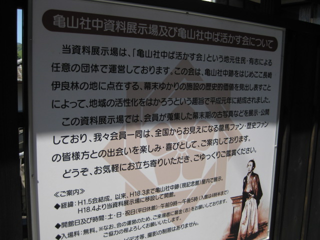 亀山社中記念館で周辺施設としてこちらの展示を宣伝していましたが実際行ってみたら平日はお休みでした。どう考えても記念館で教えてほしかったのですが・・記念館にある展示と別のものが見られると思って期待したので残念でした。