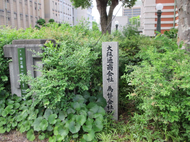 地図で大阪通商会社為替会社跡とあり、中央公会堂の前にあるとありましたが、どこなんだろうと必死で探しました。ありました。但し、小さな石にそのまま大阪通商会社為替会社跡と書いてあるだけでした。ただそれだけしか残ってないので、拍子抜けでした。