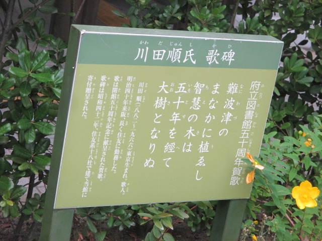 ヨーロッパ風の中の島図書館の正面入り口の左隣の芝生のような場所にあります。この歌碑はよく目立ちます。図書館の50周年に贈られたものです。「難波津のまなかに植えし知恵の木は50年経て大樹となりぬ」という大樹に例えた素晴らしい詩です。