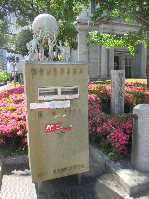 日本銀行前にあります。駅逓司大阪郵便役所跡という石碑がつつじに囲まれて建っているだけです。ただ、この石碑の横に立っている郵便ポストがユニークです。赤ではなくグレイです。そしてポストの上部に、10人くらいが球体のものを持っているオブジェがユニークです。