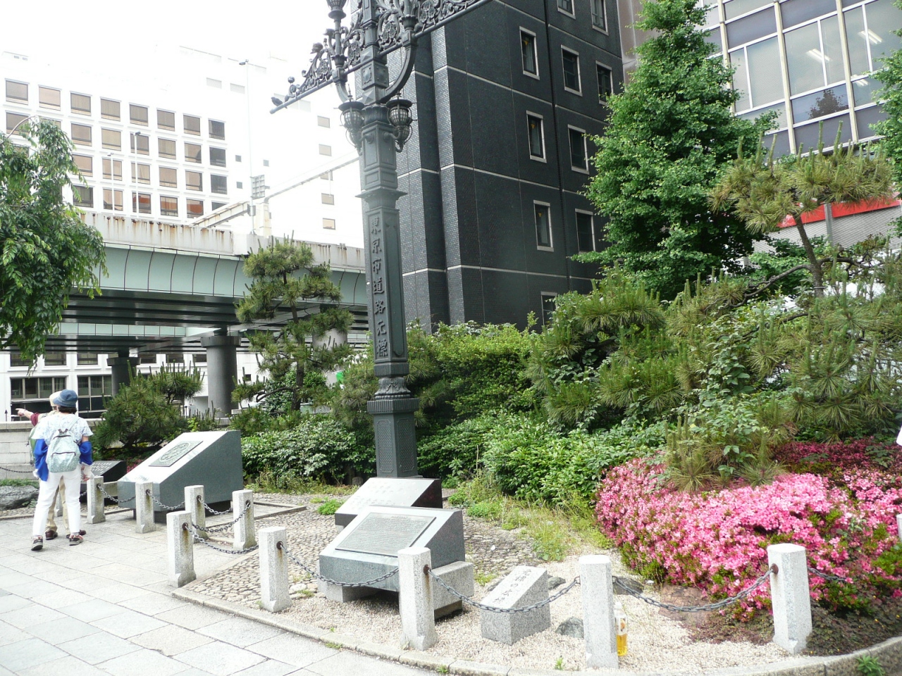 東京駅日本橋口から永代通りに出て日本橋交差点を左折すると、日本橋川の上にどっしりした日本橋が架かっています。この橋を渡ったすぐ脇に「元標の広場」と呼ばれる小さな庭があり、その中央に“東京市道路元標”と書かれたモニュメントが立っていました。