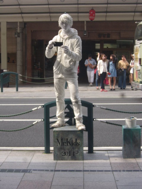 京都市内随一の繁華街として、特に休日の人混みは凄いので、田舎者的にはあまり歩きたくない所ですが、今回は日曜日の午後に通過してみたところ、歩道脇に人垣が出来ていたので、何事かと思って覗いてみたら、Mr.Kidsと呼ばれる銅像パフォーマーが立っていました。基本的にじっとしているだけ(?)のパフォーマンスですが、たまに動くそうです。特にチップを入れると、お礼の動作をすることもあるそうな…。話のタネに少しチップを弾んでみるのも良いかもしれませんね。