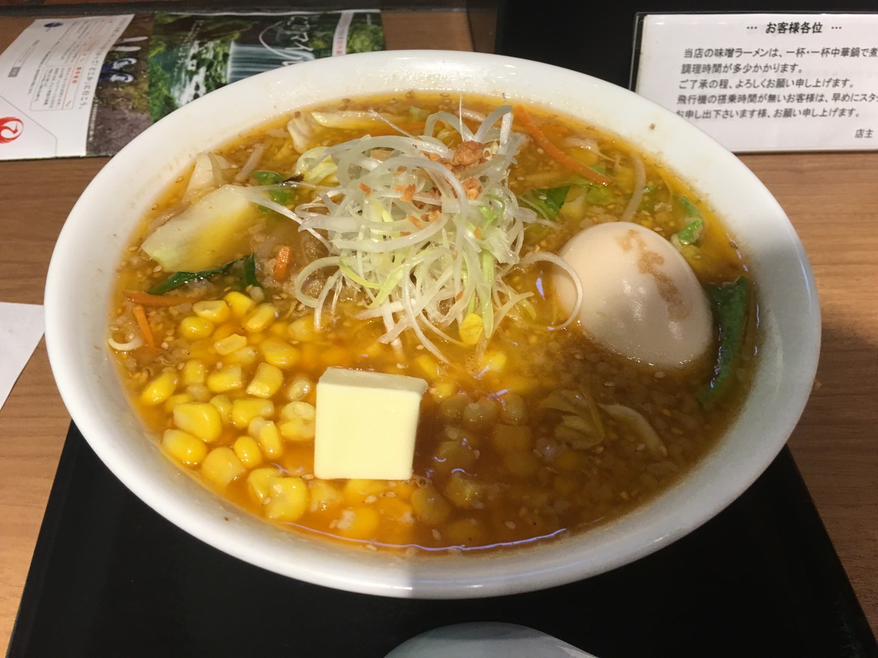 コーンバターラーメンを注文。スープの上には油の膜があり、背脂もたっぷりです。具もきゃべつ、白ネギ、人参、挽肉がたっぷり入っており食べ応え十分。スープもたんに味噌の味ではなく、深い味わいがありました。味噌ラーメンを食べてあまり感動したことはないのですが、ここのラーメンは美味しかったです。JALでもらった ハピリカを読んでいたら、声をかけてくれ、煮卵サービスを勧めてくれました。親切なスタッフにも感謝です。