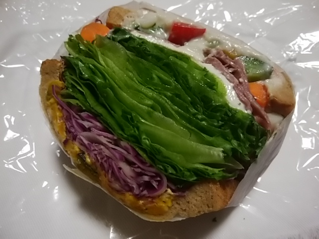 「ブーケサンド・なな色」450円(税込)です。断面を見ると、レタスがかなりの場所をとっていますが、断面的にはちょこっとしか見えていない、パストラミビーフが、かじると、中からもりもり…といっぱい出てきました。かなり食べごたえあり&450円は素晴らしいサンドイッチです。