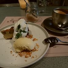 チーズケーキのほうは、カットは小さめだけど、アイス付き。セミドライのバナナかな?ねっとりというよりもポックリした食感のバナナがゴロゴロ。甘さもほどよくて、こちらは美味しかったです。