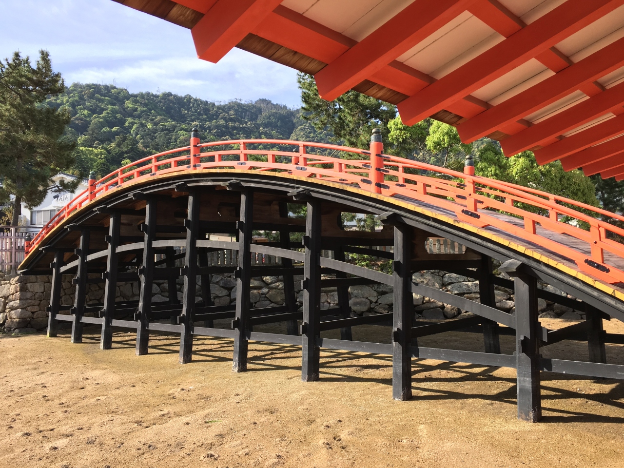 厳島神社の最後の方にあります。1557年に再建されたものが今は存在しています。天皇の勅使が来た時にこの橋を渡って神社に入ったということですが、かなりカーブが急なので、やっと着いたと思ったら最後にこんなきつい橋が、なんてことはなかったのか心配になりました。今は渡れないのが残念でした。