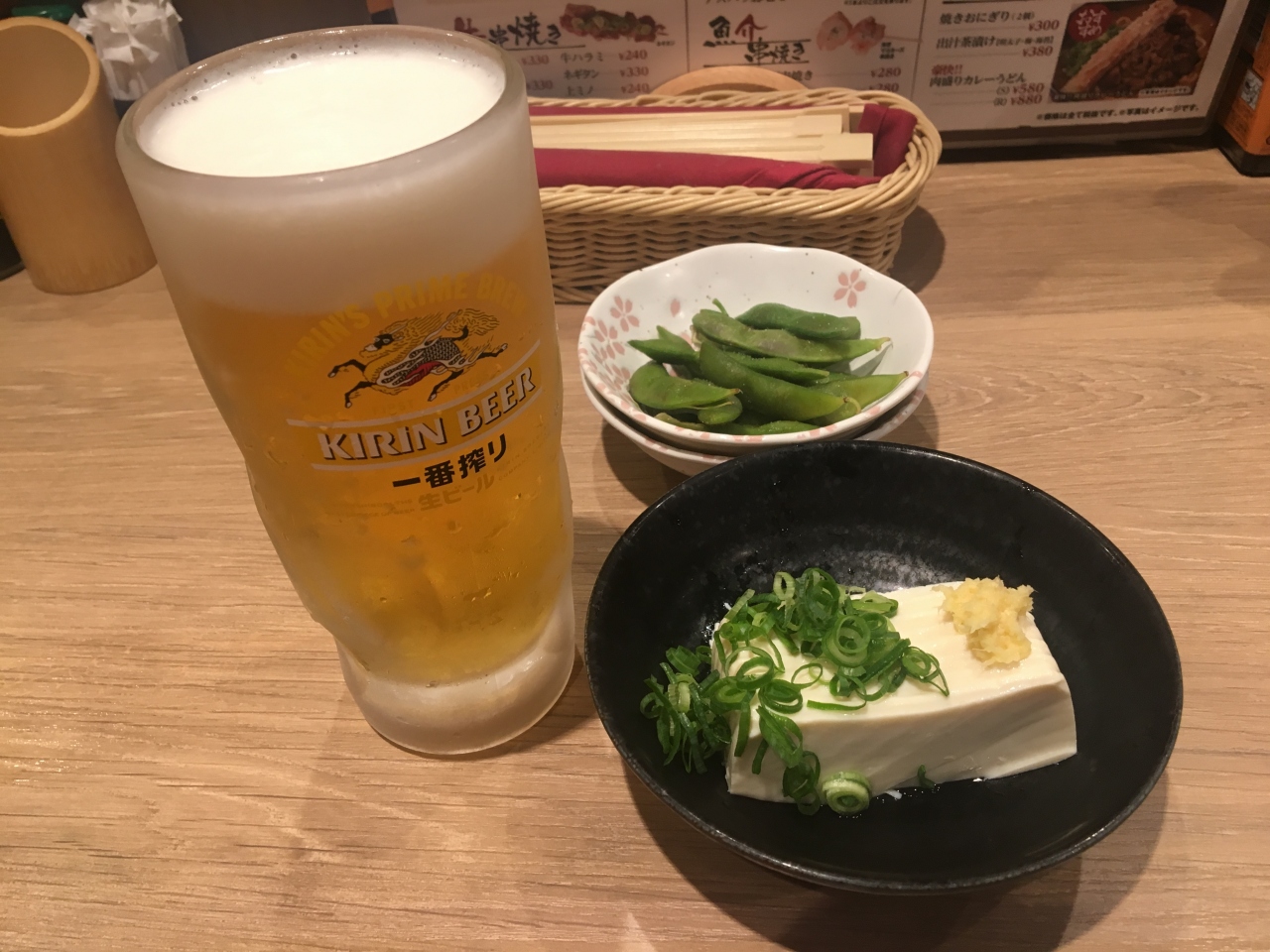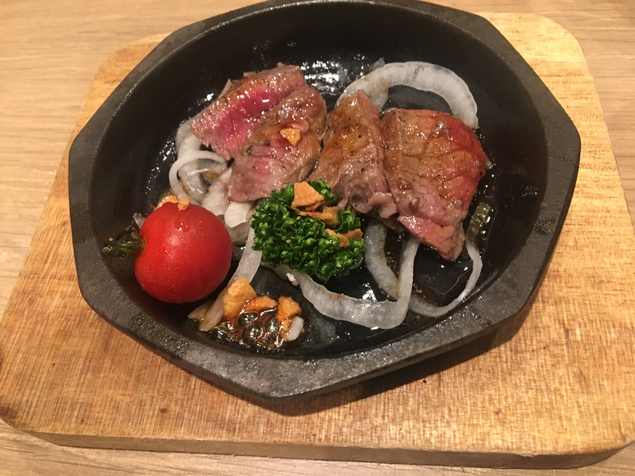 内容は、ドリンク、枝豆、冷奴、牛ステーキの鉄板焼き。