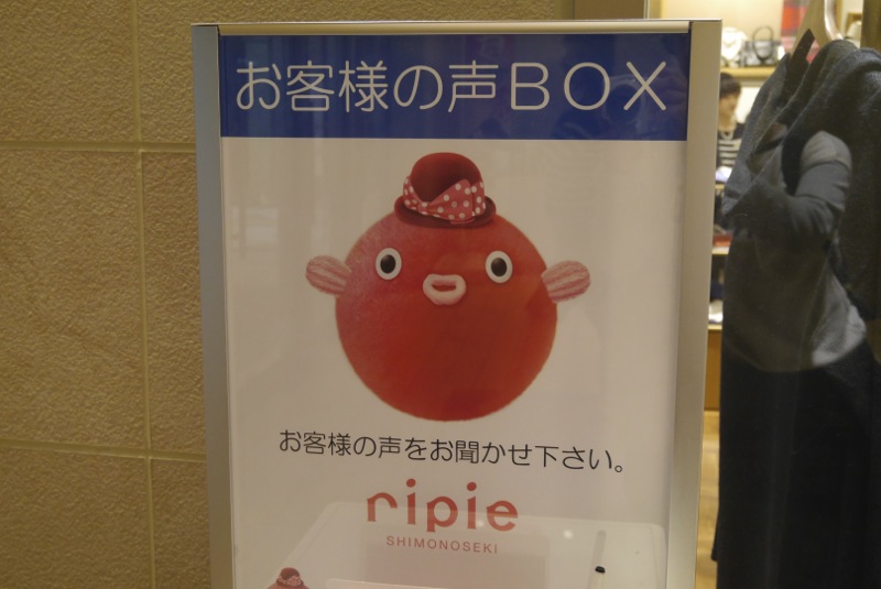 いわゆる駅ビルで、そこまでピンとくるテナントは(あくまで個人的にだけど)なかった。でも、下関といえば“ふく”の街…ここのビルのイメージキャラクター?はとってもかわいいピンクのふくで、館内ガイドにも印刷されており、思わず持って帰ってきてしまいました。